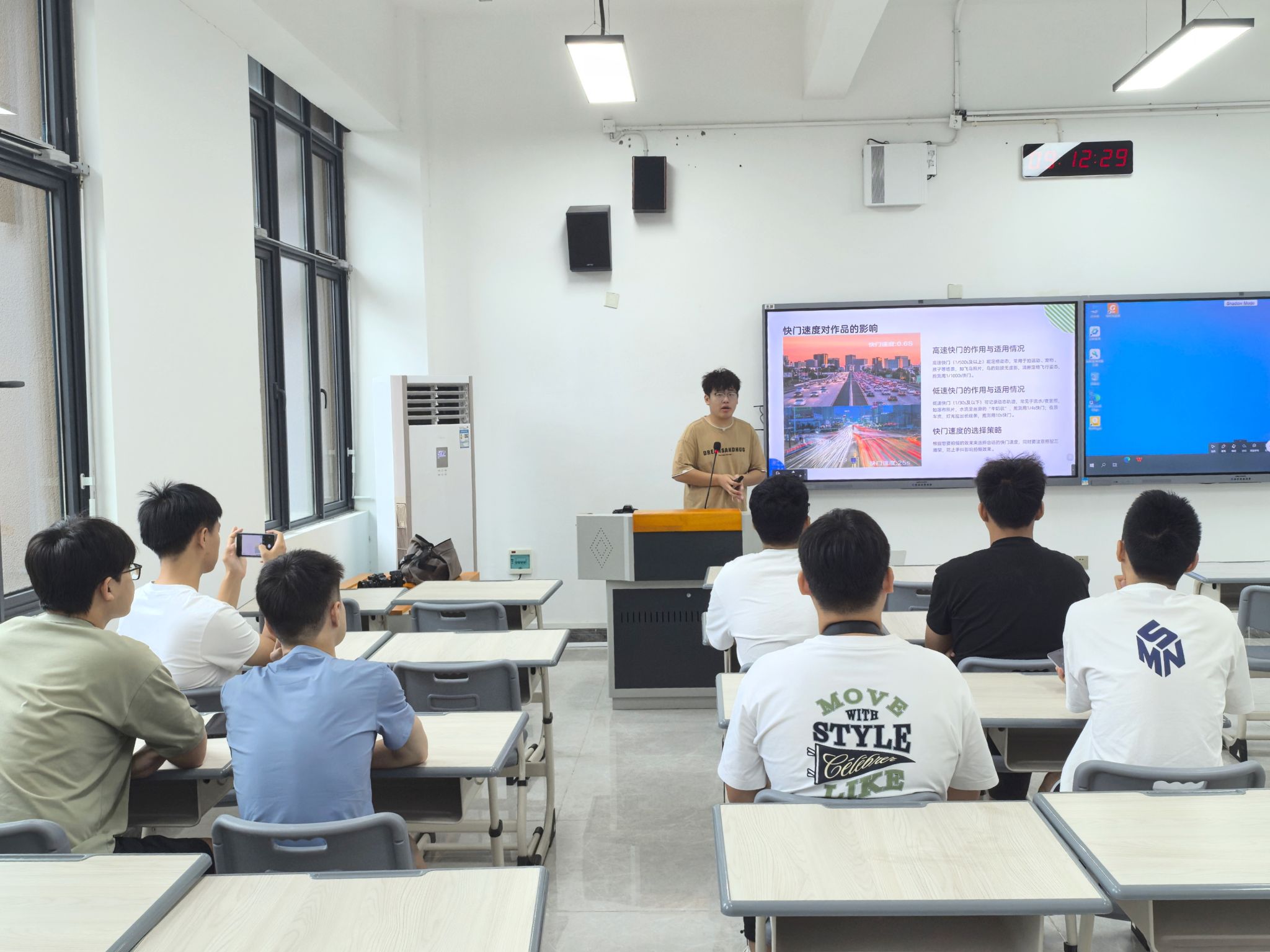 9月6日上午,“咔嚓!摄影趣课堂”开课。主讲人智农2403班钱耀昂讲解构图、快门速度、光圈与焦距的参数搭配等摄影知识,指导同学们在校园自然场景中实践拍摄。