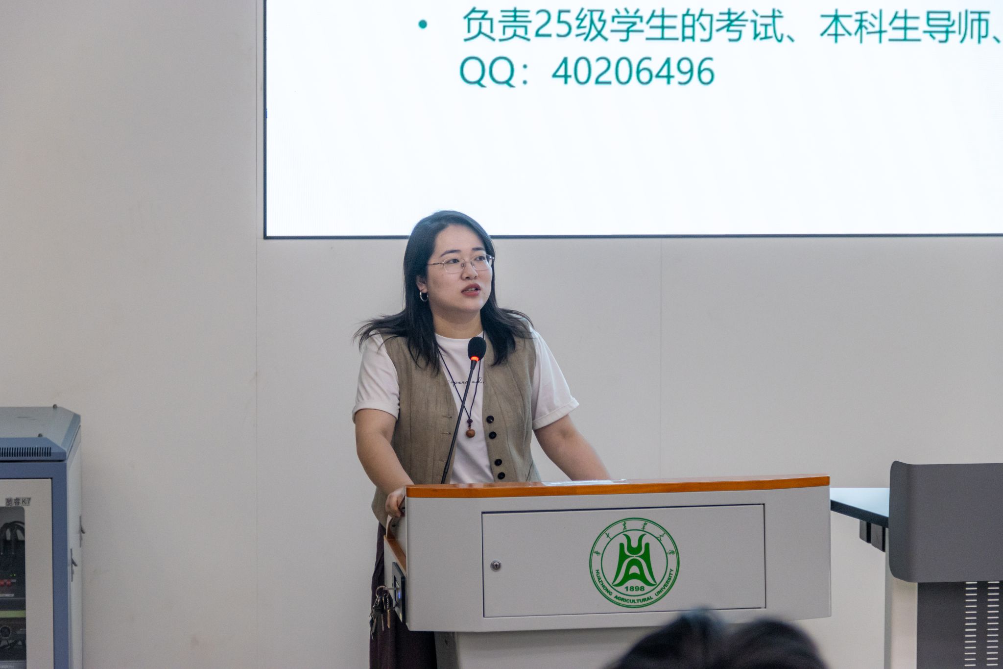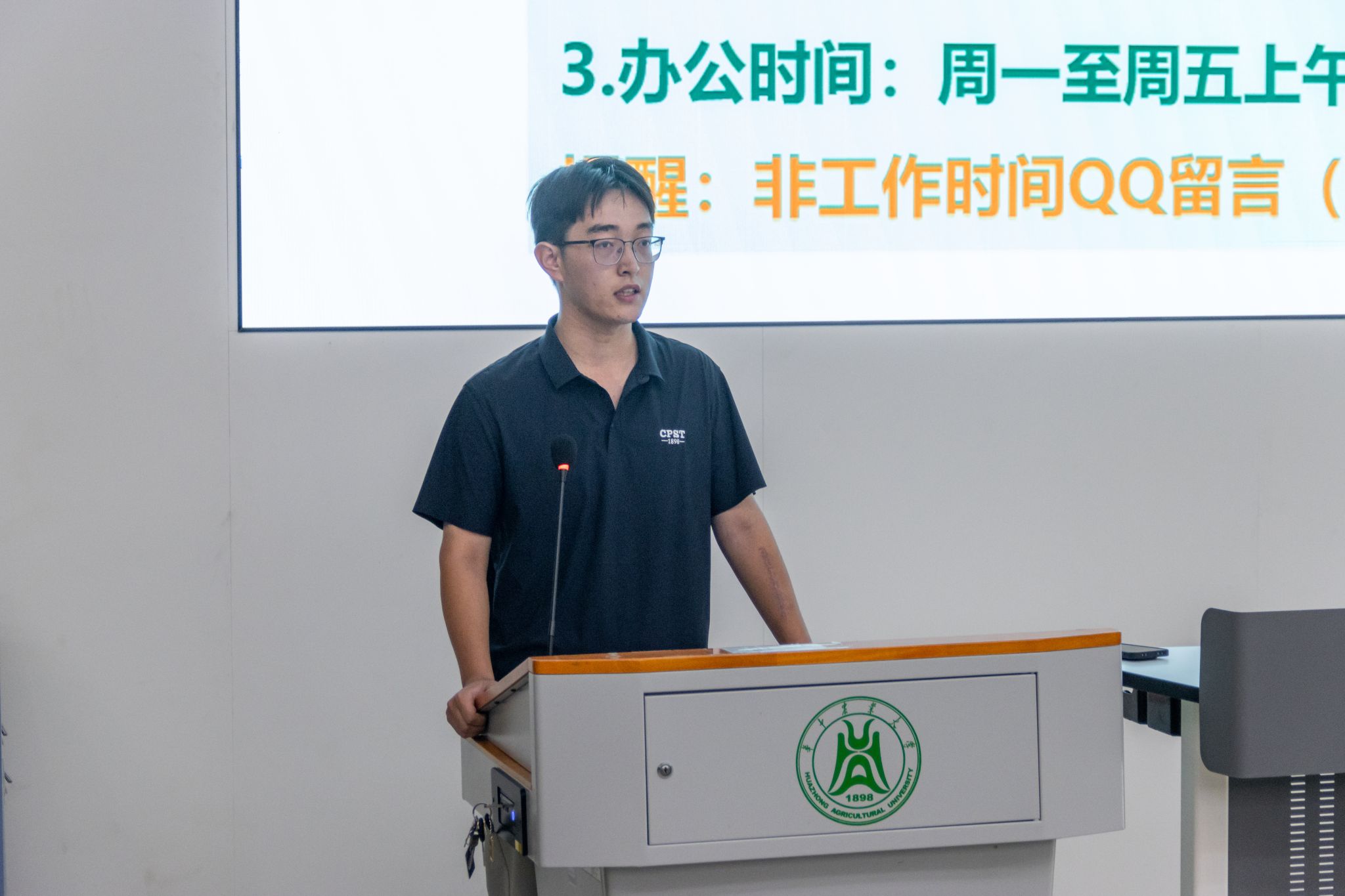 随后,公司辅导员张泽雷向新生介绍了辅导员“时代新人引领者、日常事务管理者、健康成长服务者”的角色。讲解了“QQ留言说明来意—线下见面—紧急事件电话联系”的沟通三步曲,介绍办公地点、电话及时间等信息,并强调了在外住宿、课程请假等流程,以及早锻炼、晚归、寝室安全卫生等日常行为规范,提醒新生守好财产安全、身体健康、心理健康、交通安全等自身安全红线。鼓励大家在大一的生活中善于获取资讯、做好成长规划、学会自我管理,争做卓尔不群的植科人。