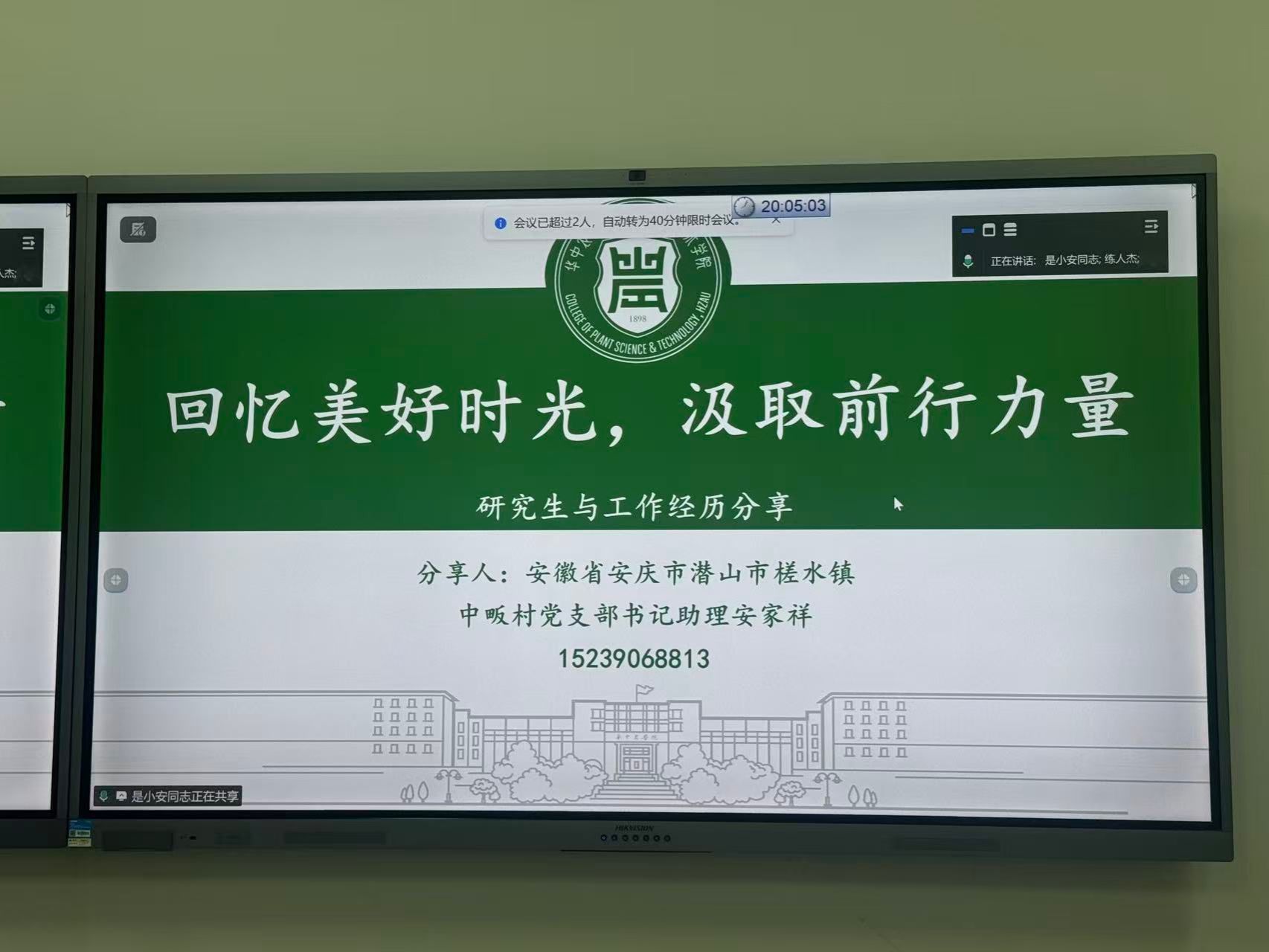 2022级研究生员工安家祥现任安徽潜山中畈村党支部书记,以“回忆美好时光,汲取前行力量”为主题分享经历。他通过PPT展示研三时期求职、秋招、读博备考的多元选择,并以“适合自己的就是最好的”为核心,鼓励学子在探索中提升自我,为在场同学注入前行动力。