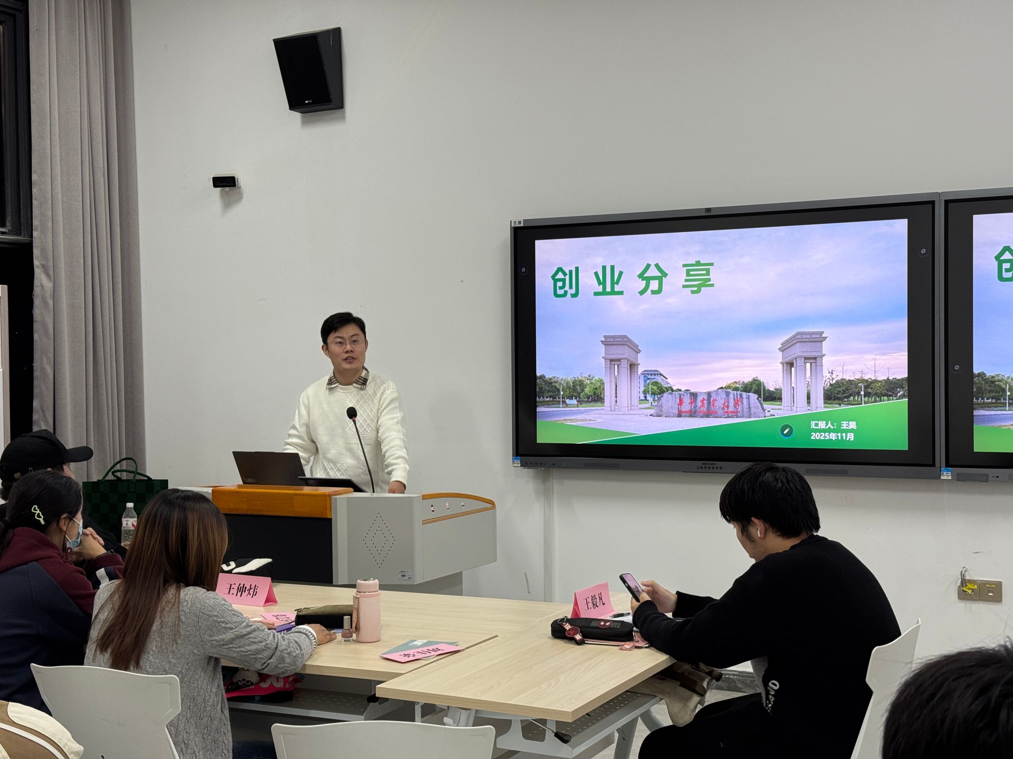 2017级研究生员工王昊从本科时期的创业“小白”说起,当年与同学组建4人团队,从校园驾校项目起步,陆续涉足研学、农业培训、新能源汽车服务等领域,在试错中积累实战经验。2024年,他聚焦“高端用车接待”赛道成立公司,开发专属服务系统赋能行业效率提升。“2023年才清晰找准方向,”王昊提醒学子,大三、大四前需梳理职业方向,理性试错、聚焦优势。
