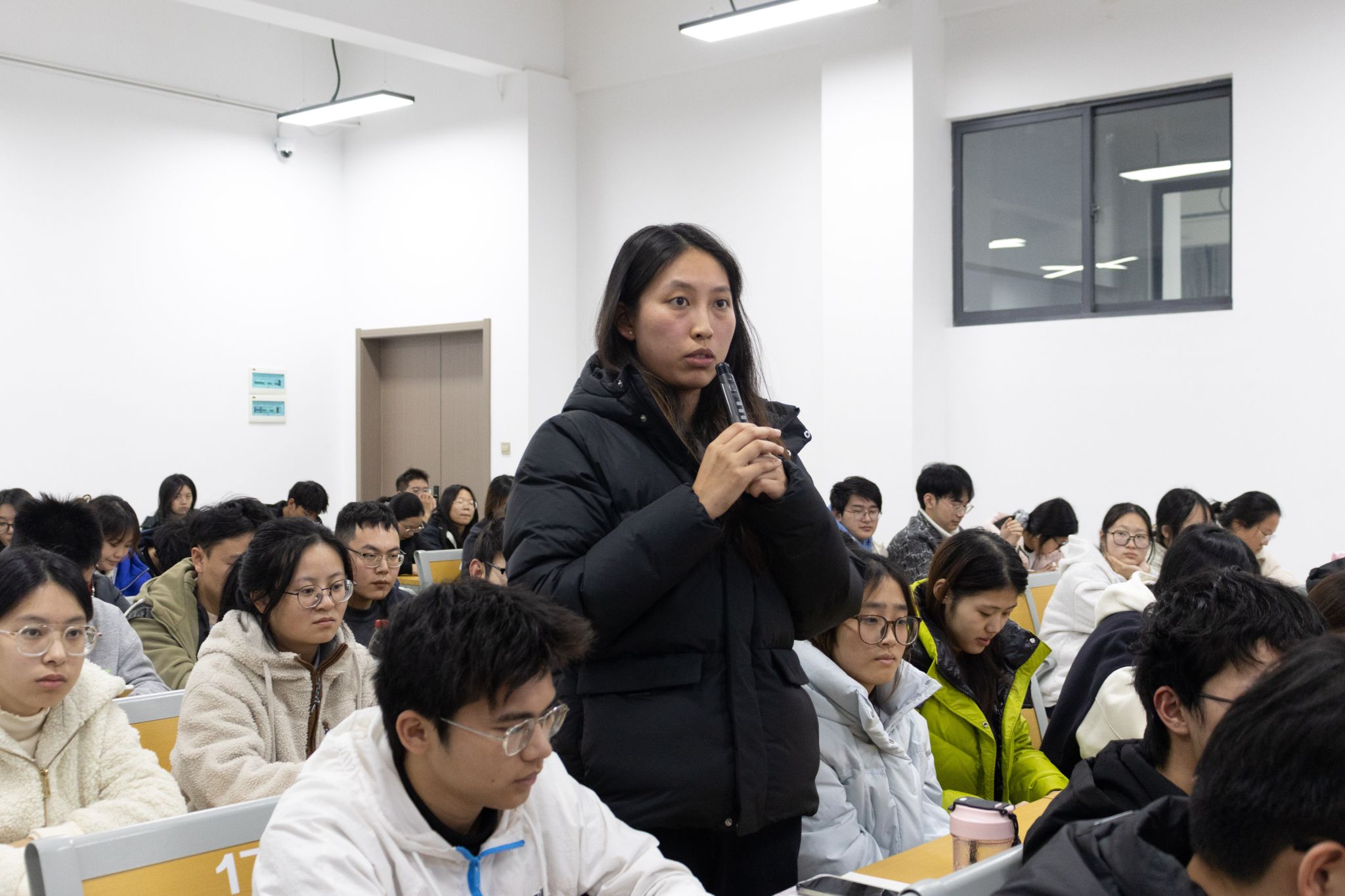 讲座尾声,熊姣军与现场同学展开热烈的互动交流。智农2406班李丹梅结合自身专业学习困惑,提出“智慧农业技术在基层农业场景落地时,如何平衡技术先进性与农户接受度”的问题。熊姣军以团队推广智能农机的实践为例,分享了“先建示范田让农户直观看到成效、简化操作流程适配农户需求、联合村干部做好技术科普”的落地经验,并鼓励同学们在专业学习中多关注田间地头的实际需求,让技术真正服务于农业生产。
