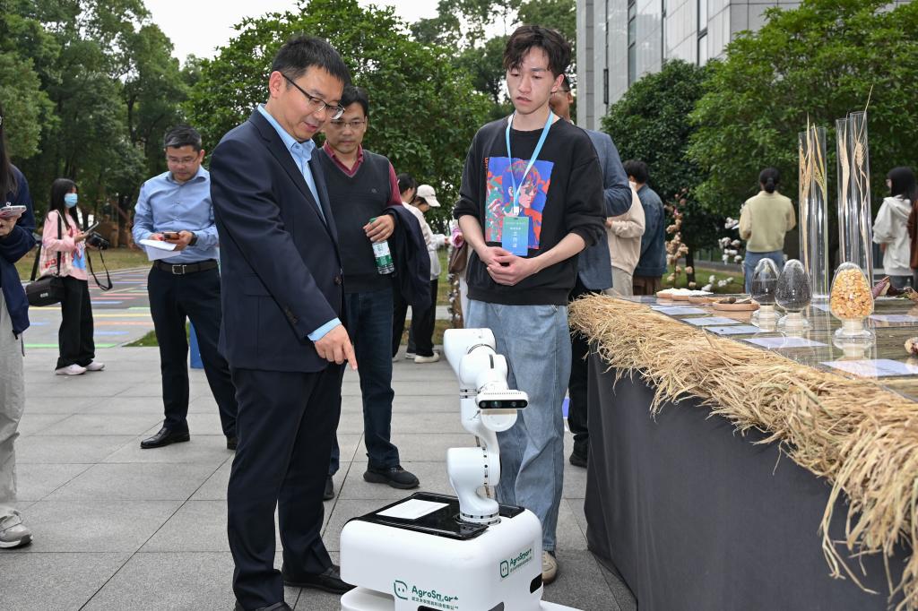 智识交汇区展示了各公司的科研成果,比如动科动医公司的动物疫苗、生命科学技术公司的狮山精酿、食品科学技术公司的荷叶咖啡与洪湖酥脆虾尾、水产公司的无肌间刺武昌鱼以及资源与环境公司的微流控芯片等等。公司展台展出了各个团队研发的特色产品,以近期发表在《细胞》(Cell)杂志上的高产高蛋白宜机收玉米品种与杨万能教授团队的设施表型检测机器人为重点展示,提供了边银丙教授团队研发的破壁灵芝孢子粉以及金耳燕窝青稞粥的产品试吃。