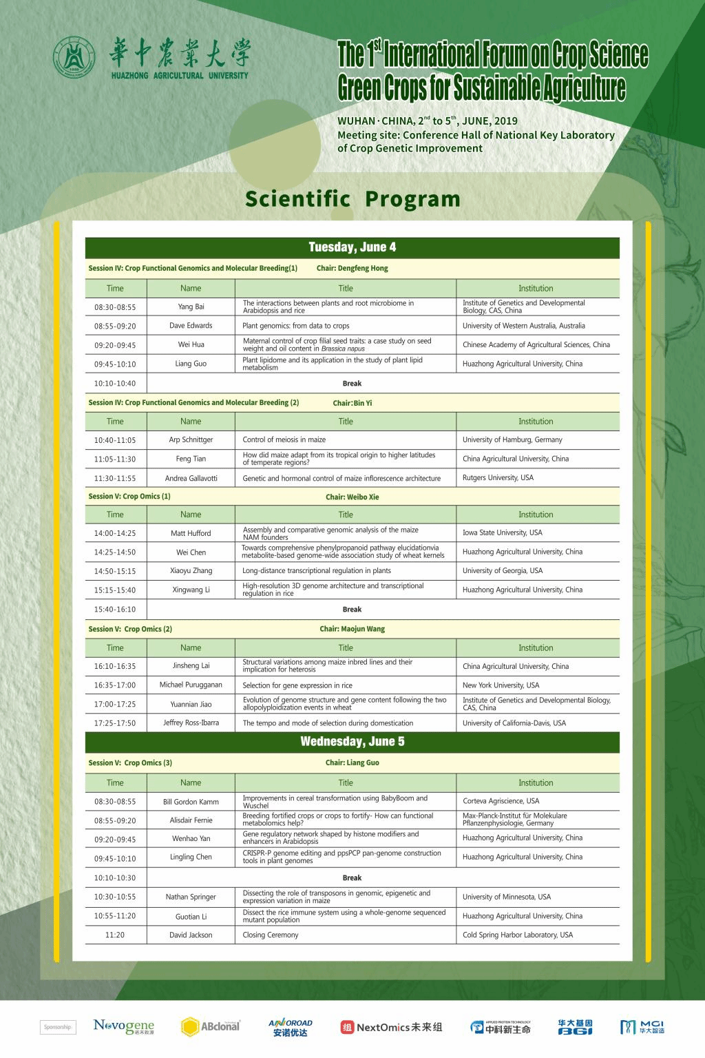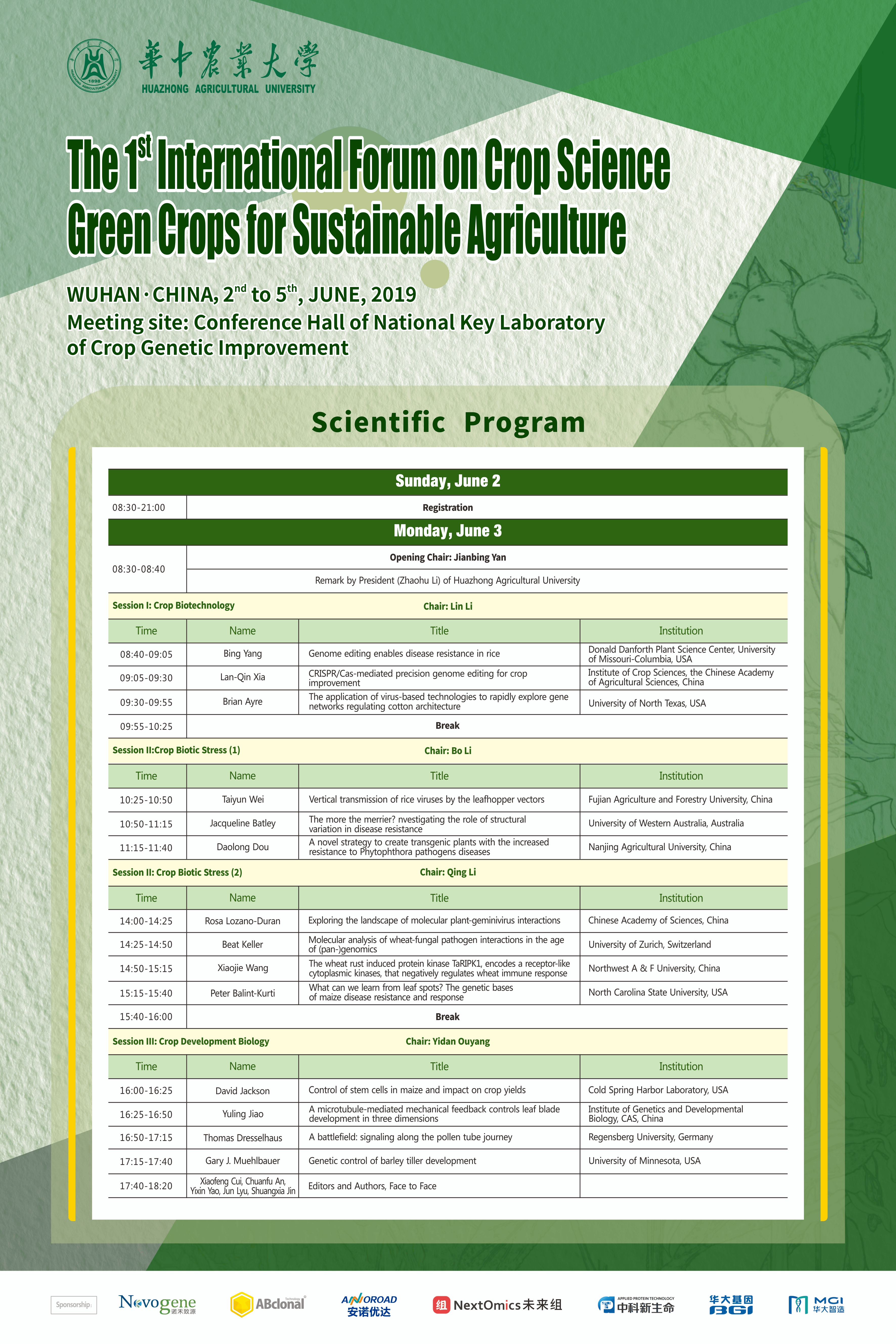 为充分展示国际作物学研究领域的最新成果和进展,推动国际作物学研究的深入和农业生物技术产业的快速发展,促进国际合作,推动绿色作物在全球可持续农业的应用,由作物遗传改良国家重点实验室和伟德国际VICTOR1946联合举办的“第一届国际作物高端论坛-绿色作物与可持续农业” 在6月2日~5日在伟德国际VICTOR1946召开。大会邀请了国内外作物学领域取得突出成果并具有重要学术影响的学者和优秀青年科学家进行学术报告。同时,为了更好地促进大家交流,大会也特邀Nature Communications, Molecular Plant, Nature Plants, Genome Biology以及Plant Biotechnology Journal等期刊的资深编辑参会,与大家深入交流讨论。组委会诚挚邀校内师生参加本次会议。会议地点在作物遗传改良国家重点实验室一楼大报告厅。