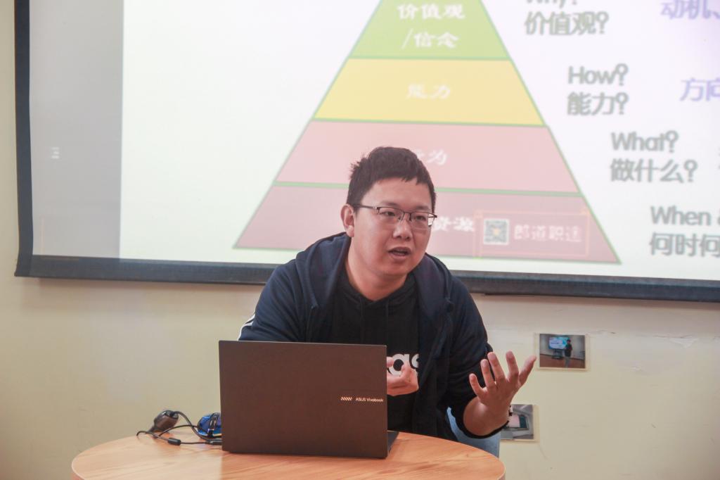 完成对生涯规划的解读后,肖晗以霍兰德职业兴趣测试和MBTI性格测试为例,分别从“知己”和“知彼”两个方面向同学们介绍了如何进行职业生涯规划。他提醒大家对内建立正确的自我认知、对外了解职位和行业的发展趋势。