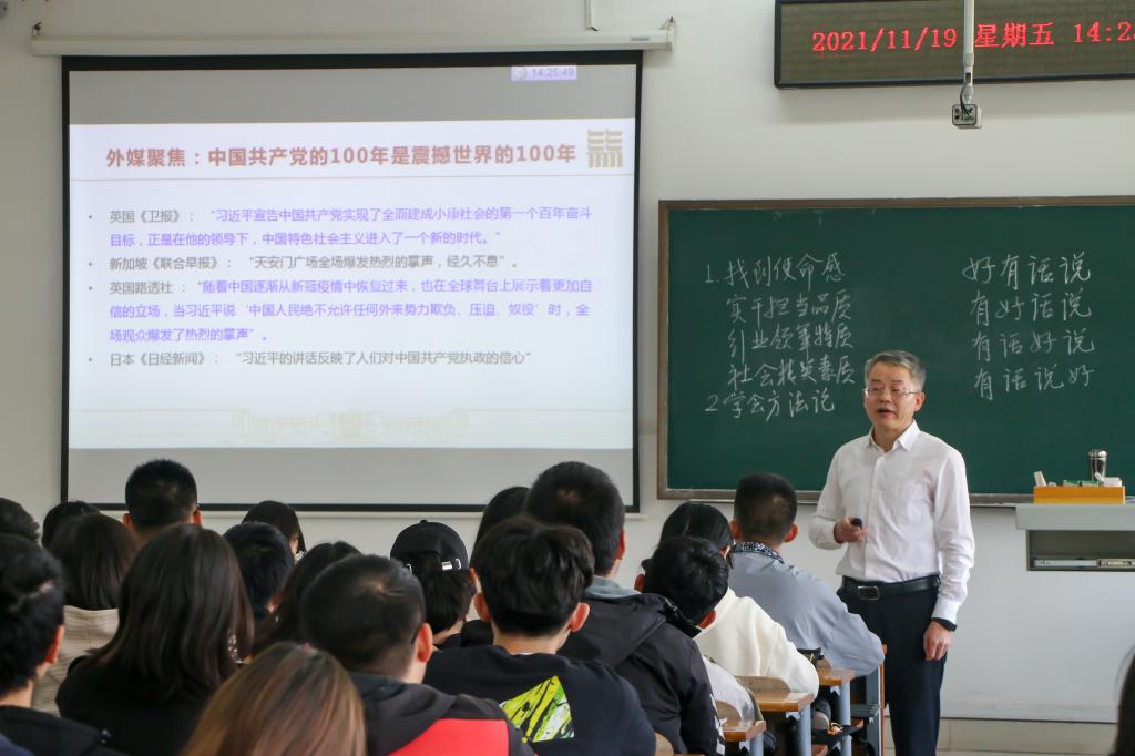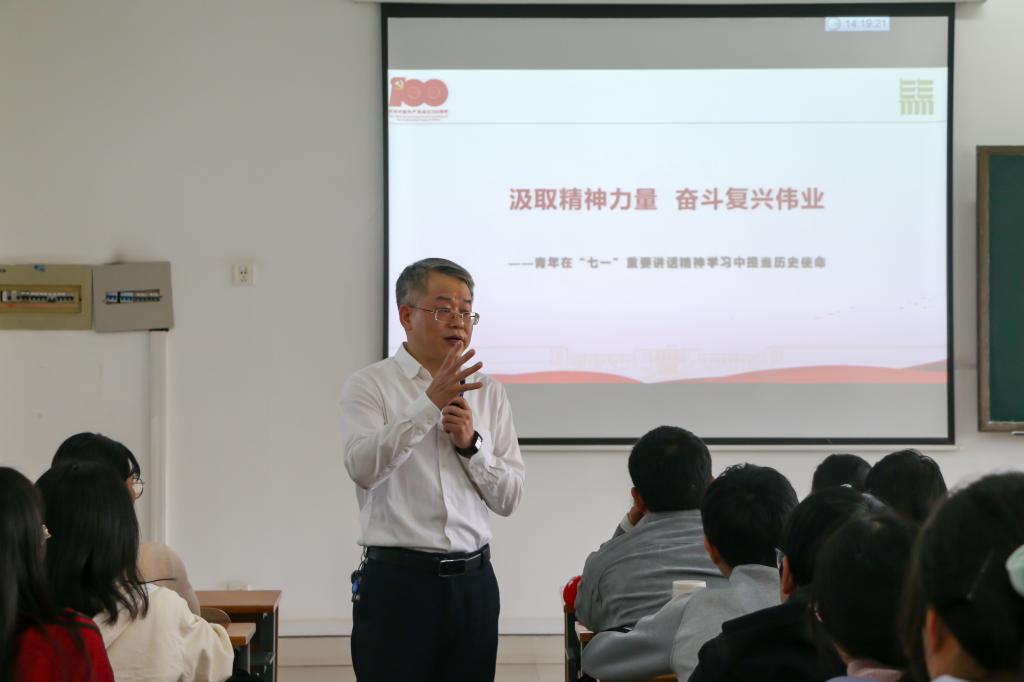 廖济忠解读了“坚持真理、坚守理想,践行初心、担当使命,不怕牺牲、英勇斗争,对党忠诚、不负人民”的伟大建党精神,希望同学们继续弘扬光荣传统、赓续红色血脉,永远把伟大建党精神继承下去、发扬光大。