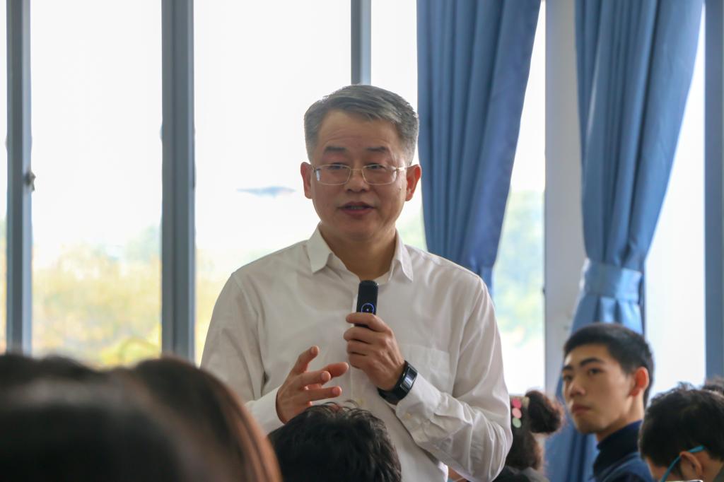 课堂伊始,廖济忠向同学们提问“上大学是为了什么”,以自己的求学经历为例,勉励同学们在大学期间找到使命感、学会方法论。