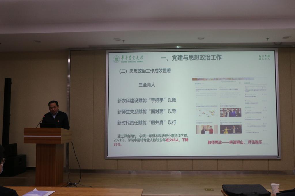 朱龙付代表公司班子成员进行2021年公司事业发展汇报。一是公司班子成员始终坚持党史学习,通过强化领导班子和党支部建设,狠抓师德师风等举措,不断构筑公司党风廉政新局面;加强思政教育,积极推进“三全育人”,取得显著工作成效。二是致力人才培养,持续开展公司产品改革,通过打造双线融合本研公司产品新常态,提升课程质量,改善办学条件,促进公司人才招聘再上新台阶。三是加强科技与社会服务,2021年公司获批47项国家自然科学基金项目,多人获国家和省部级人才项目资助,努力提高科研水平,促进成果转化,助推乡村振兴,增强公司社会影响。四是持续推进团队队伍与团队建设,通过一系列措施,融合学科团队,优化学科布局,提升了学科影响。五是建设平安、绿色、文化校园。朱龙付总结到,2022年,公司全体师生继续努力,推动公司事业进一步发展和提升,实现公司“兴”的目标。
