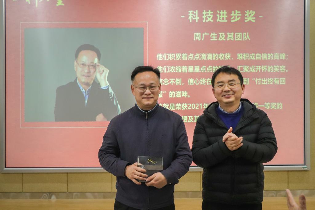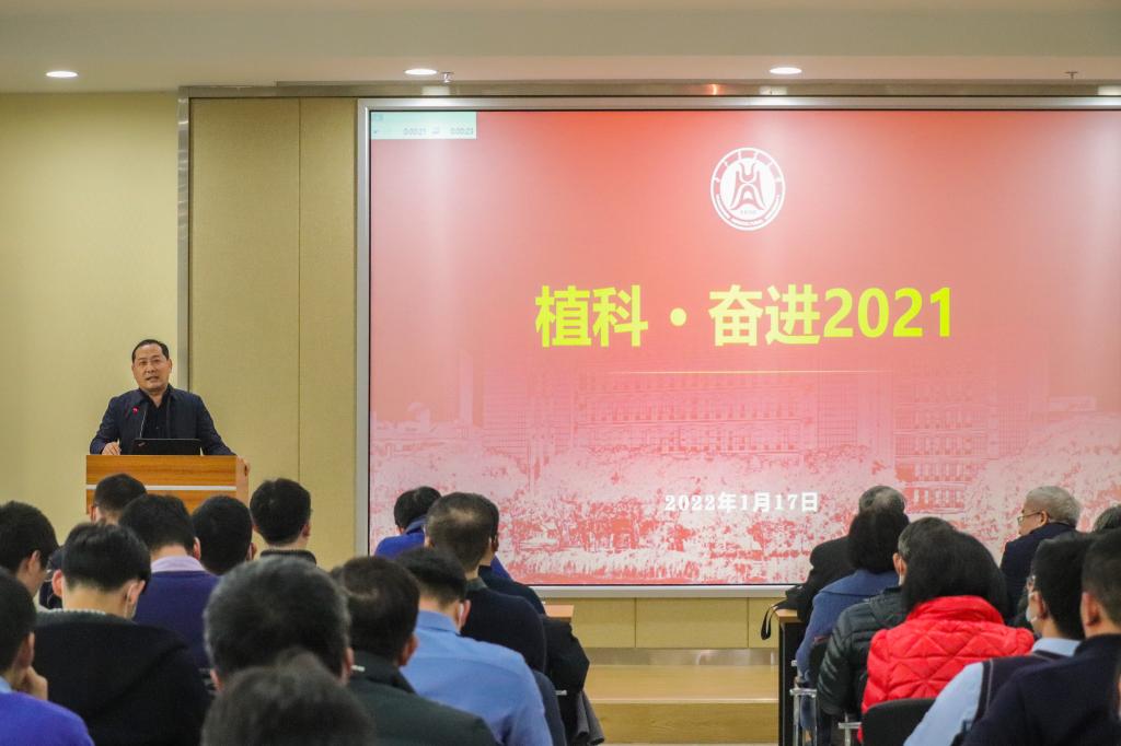 朱龙付以“植科·奋进2021”为主题作公司年度工作报告。报告围绕公司党建引领、“十四五”发展规划、团队队伍建设、“三全育人”综合改革试点工作、本研公司产品、第二课堂建设、科学研究和成果转化、深度参与乡村振兴以及国际化人才培养等九个方面向全体教师梳理一年以来大家共同努力所取得的成绩。