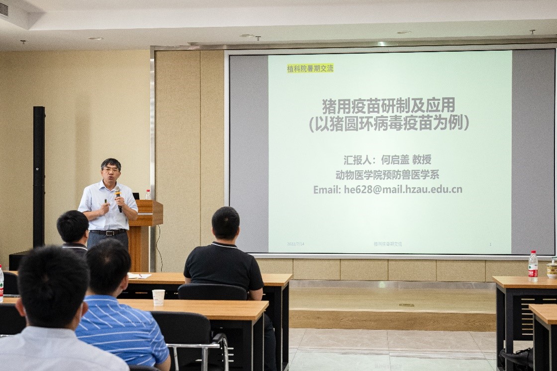 动科动医公司何启盖教授作为特邀嘉宾与公司教师交流。他从畜牧业的重要地位和疾病防控在养猪产业中的重要性开始,介绍了他选择猪圆环病毒病为研究课题的初衷,并展示了他的研究历程和研究中遇到的各项挑战。何启盖教授还期待与公司进行深入合作,践行“种养结合”的交叉研究。他希望用问题驱动研究,用科学驱动产业,“用‘纯技术’,健康动物,健康食品,健康人类!”