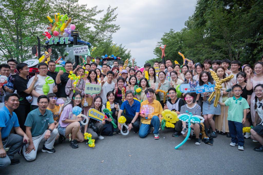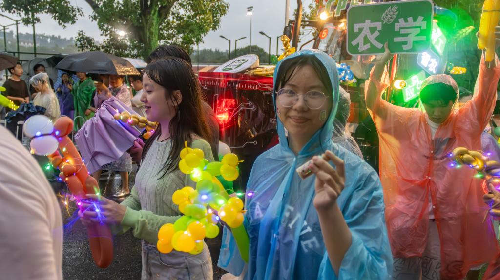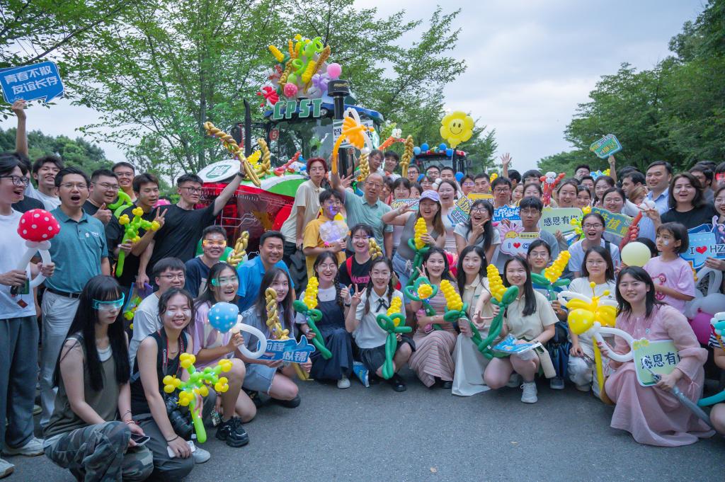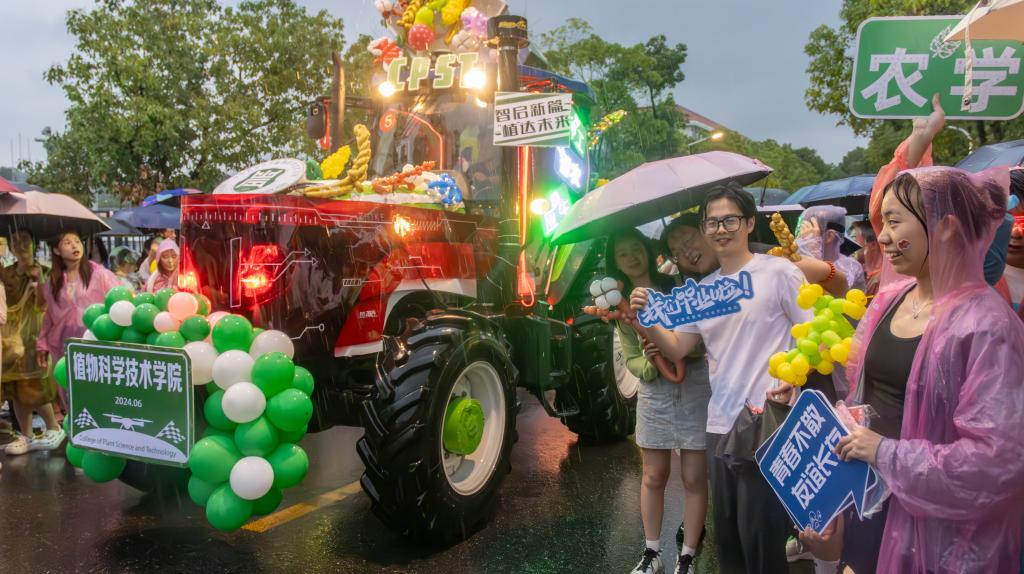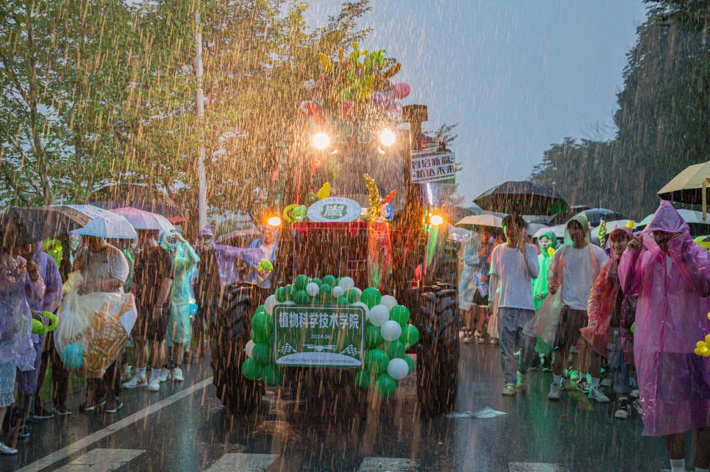 尽管巡游过程中时有阵雨来袭,参加巡游队伍的师生们依旧热情互动,欢乐留影纪念。本次巡游装扮员工负责人于子杰激动道:“今年我们植科院花车融合了传统植物生产与现代智慧农业特色,打造出了科技感、未来感兼具的花车。经工公司同学协助,我们克服了选材、固定等难题,我也深刻体验到交叉学科学习的重要性。”