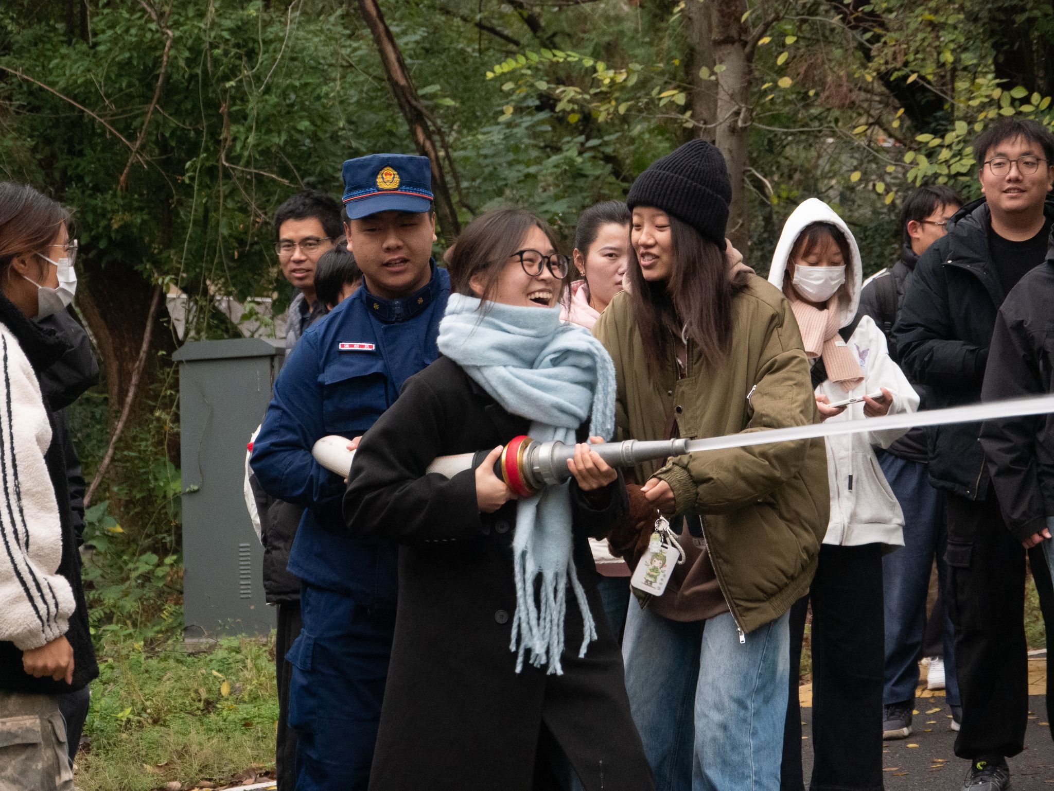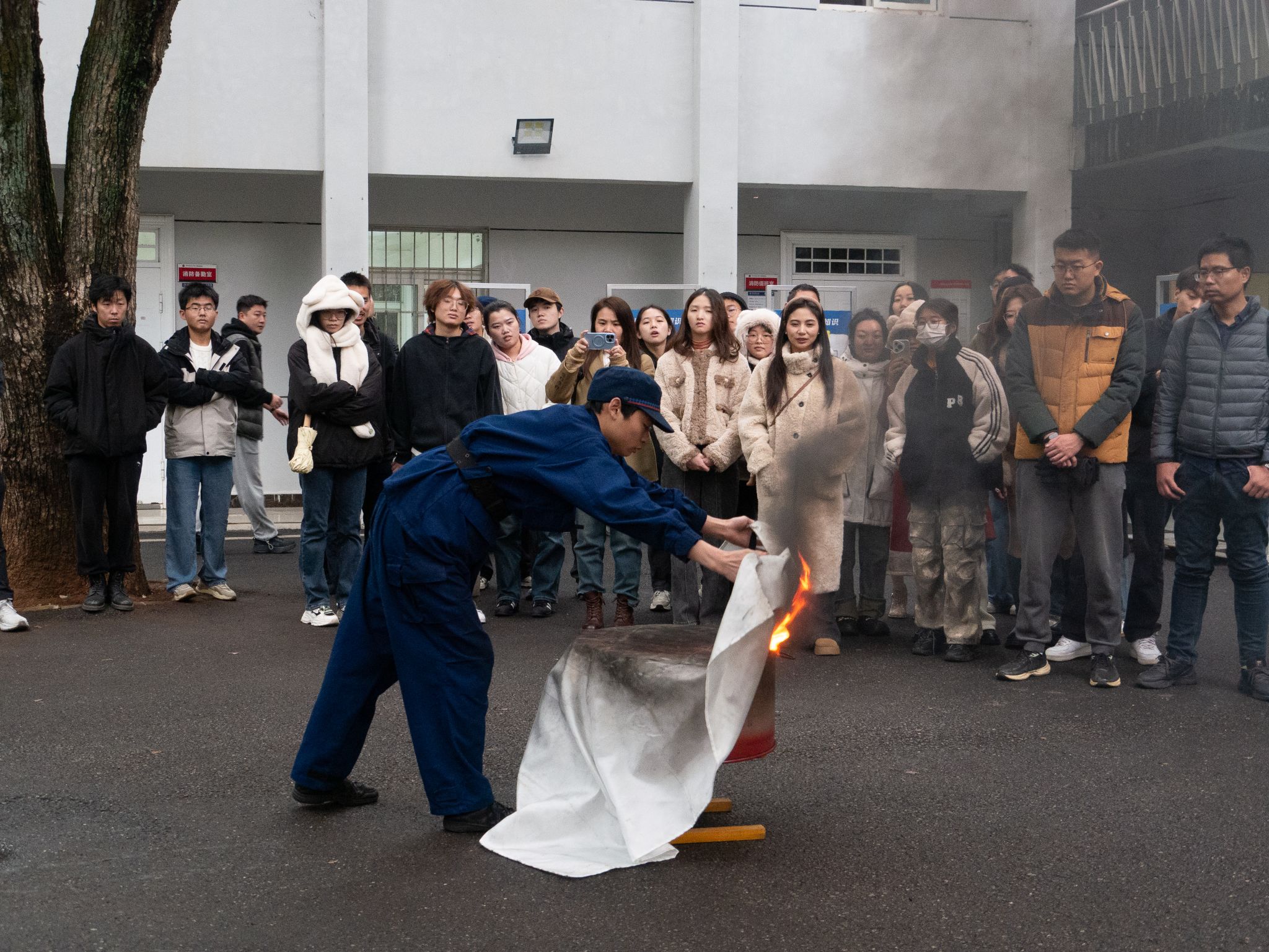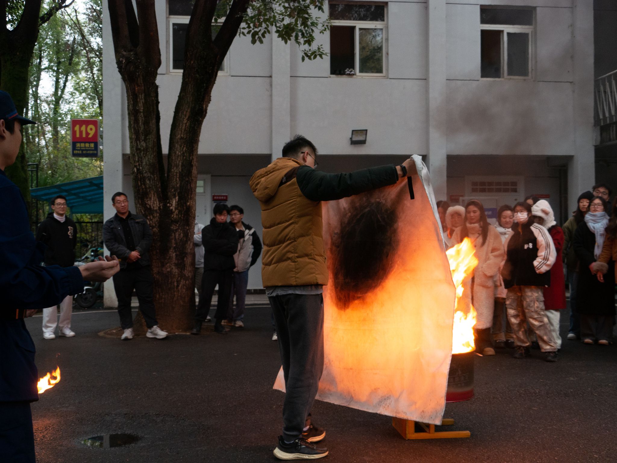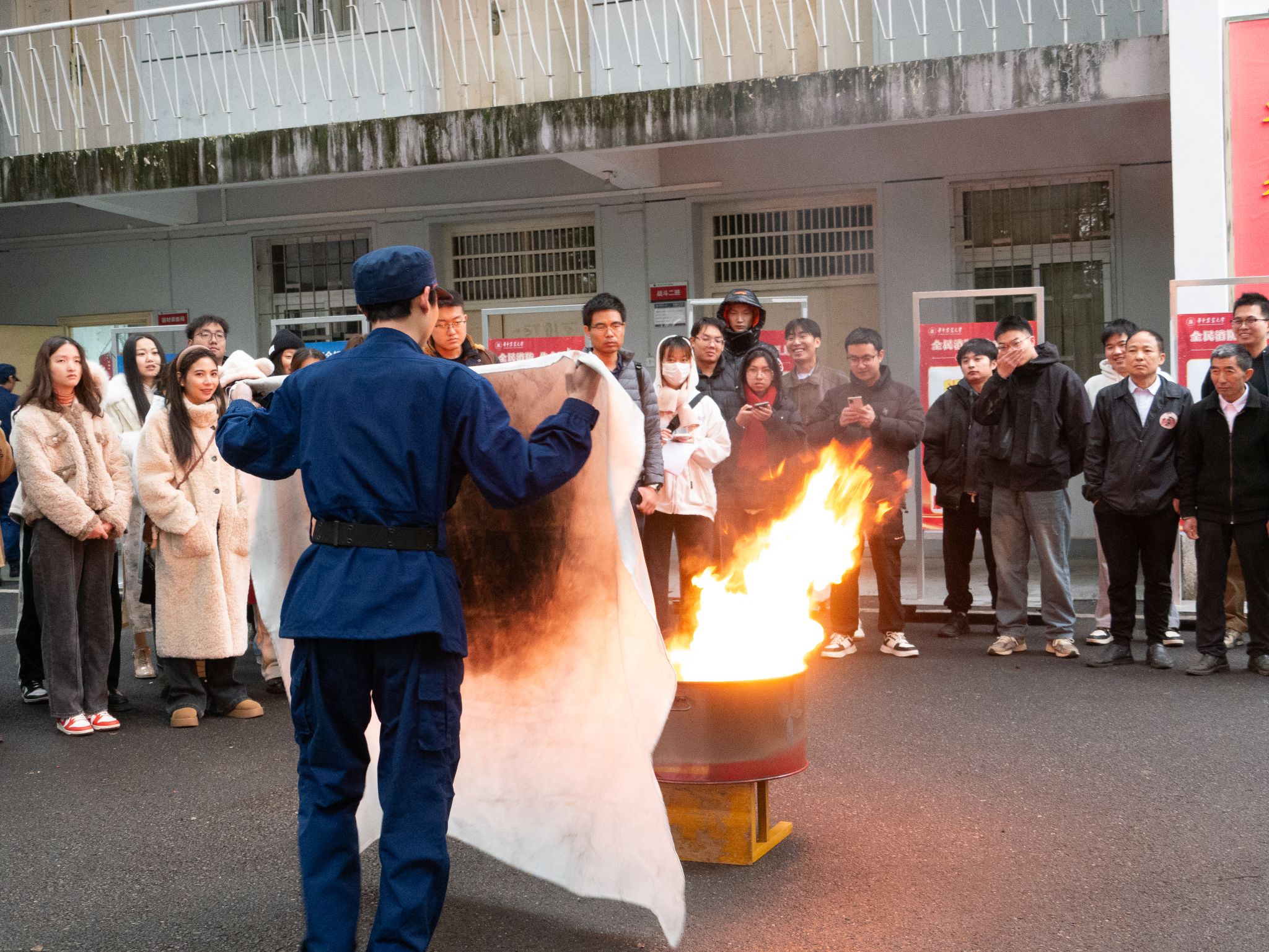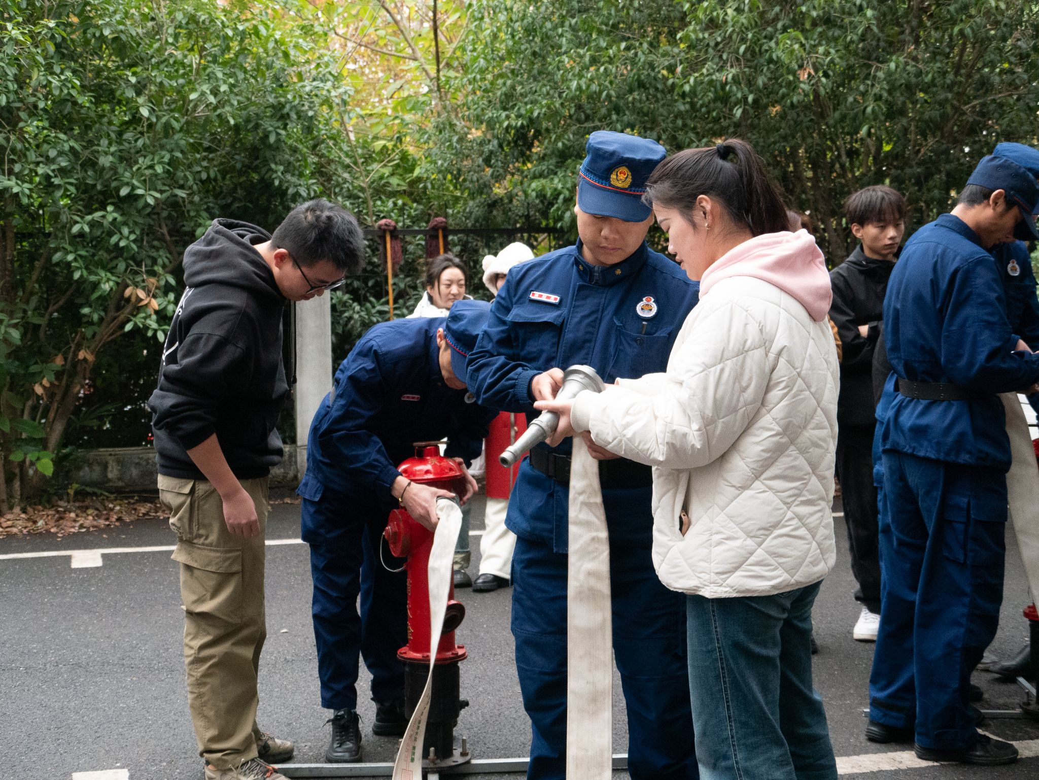 消防员讲解了灭火毯的正确使用方法,要确保灭火毯能形成一个保护屏障,完全覆盖火源,不留缝隙以隔绝空气,从而达到灭火效果。随后演练了消火栓的操作流程,包括如何开启消火栓、连接水带,以及正确喷射水枪等关键步骤,并强调需要两人协作。随后,师生们轮流进行了实操演练,通过亲身体验,大家不仅熟悉了灭火毯和消火栓的使用方法,还提升了应对火灾的实际操作能力。在演练过程中,消防员始终保持警觉,不断提醒师生注意安全,及时指导并纠正不当的灭火操作,确保整个演练过程安全高效。