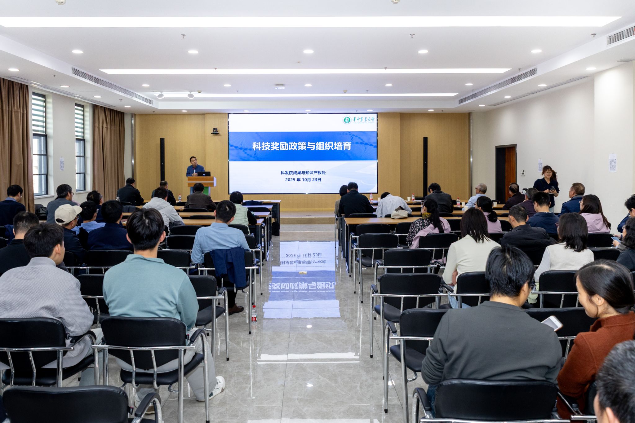随后,科发院成果与知识产权处处长许炎生作科技奖励申报辅导报告。他深入剖析了科技奖励在人才成长与学科发展中的战略意义,强调奖项申报对教师职业发展的重要支撑作用。他指出,当前公司教师在报奖积极性,尤其是年轻教师和高层次人才的参与度上仍有提升空间,并强调报奖材料核心在于对已产出成果的提炼、总结与拔高,鼓励教师们破除“报奖复杂”“非一等奖不报”等认识误区,鼓励教师以“成果积累意识”主动参与报奖。