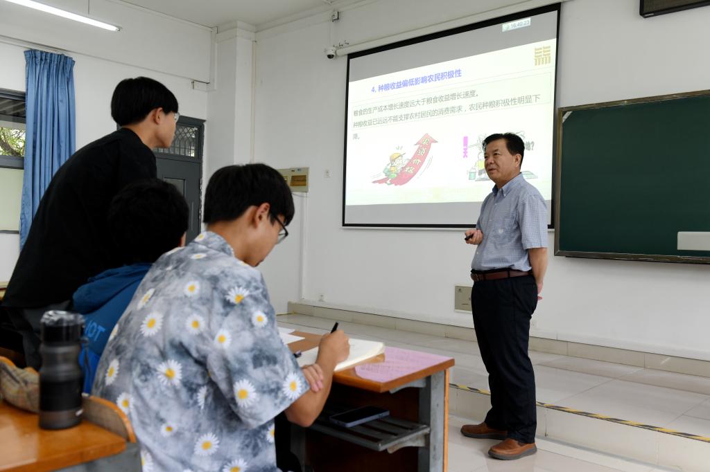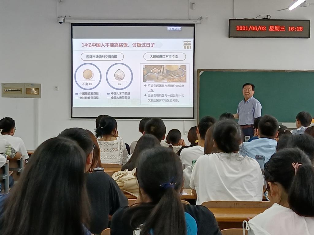 课堂伊始,姚江林解读了2021中央一号文件热点、中国三农发展关键词等新闻热点。接着,姚江林为同学们解读了粮食安全的重要性,将其比作“国基民命”,他指出,粮食必须安全,14亿中国人不能靠买饭、讨饭过日子。当前,粮食需求仍处在上升通道,粮食缺口在500亿斤左右。从中长期看,我国粮食供求将保持紧平衡态势。姚江林表示,唯有控好“怎样吃饱”到“如何吃好”的粮食消费防线,控好有人种田、有田可种的粮食种植防线,控好中国碗装中国粮的粮食安全防线,中国粮食安全才有保障。