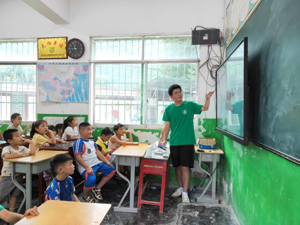 方田甜采用小游戏与知识点结合的方式,寓教于乐,调动起了孩子们学习数学的积极性,让同学们在逻辑思维和空间思维方面都进行了锻炼;美术课上,蒙泳妍通过视频资料让同学们感受百年祖国的沧桑巨变,随后以“我和我的祖国”为题作画,进行党史宣传教育;李洪宇和史炽天将篮球和足球的基本要领与规则教给同学们,并传授了部分技巧,让孩子们自由练习。