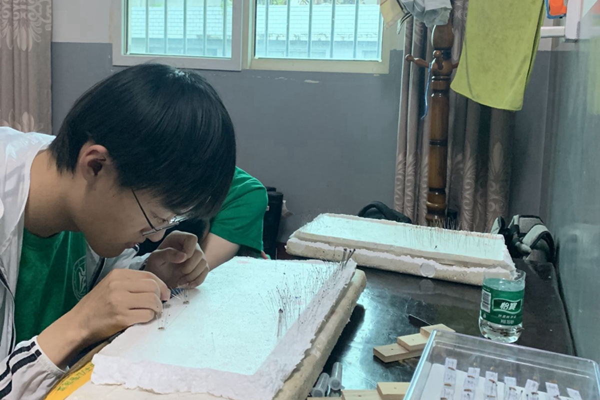 发现问题后,他们立刻修正方案,着重向杂草丛生的滩涂探去,拨开叶片,敲打树干,拨动灌木丛,以此找寻贴在叶片或地上的雌虫。茅草的叶片很锋利,一晚上下来,手上全是通红的划痕和肿胀的包。贴在叶片上的除了雌虫,还有发暗绿色小光点的幼虫。实践结束后,队员们感叹:“科研工作者真的很不容易啊!”