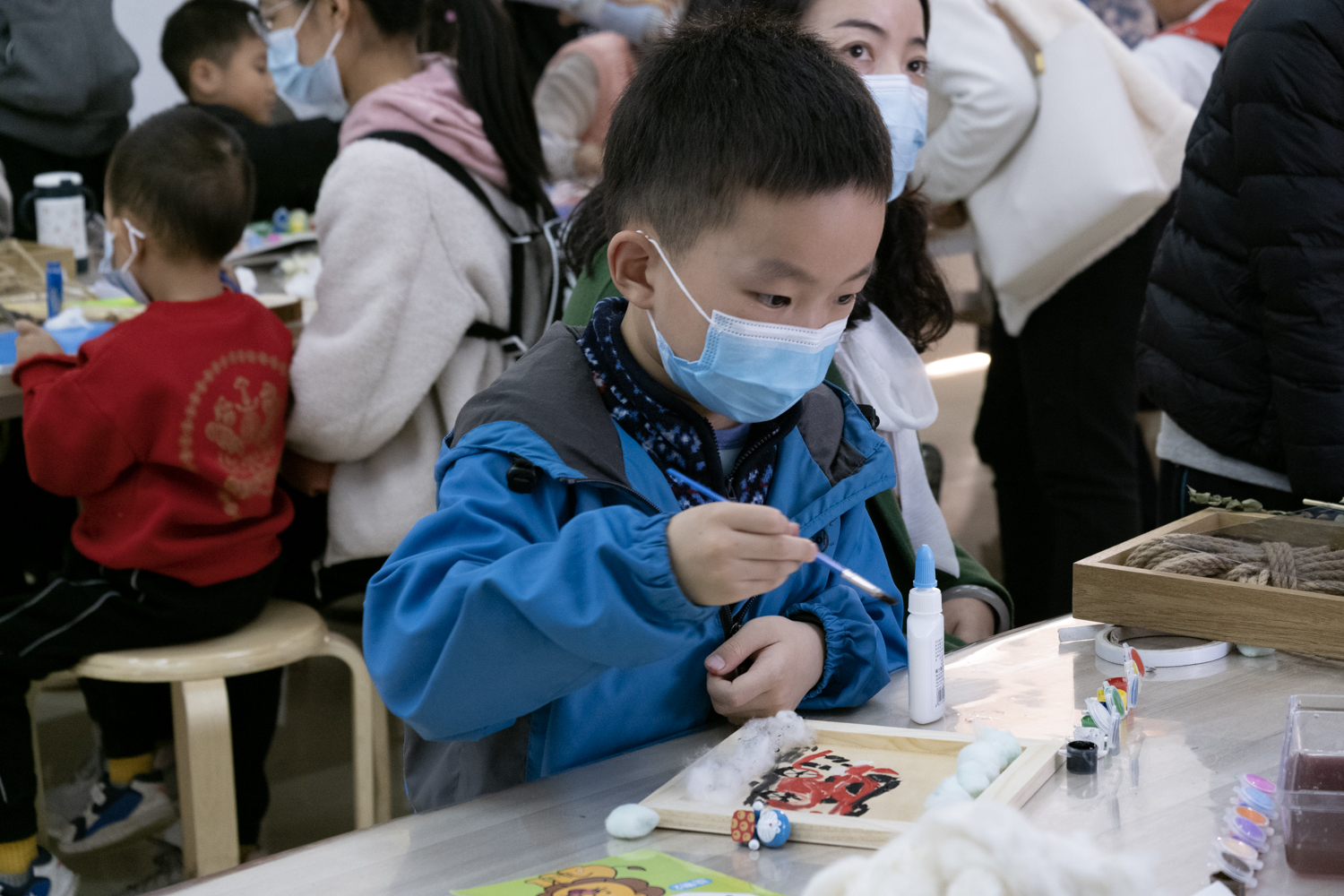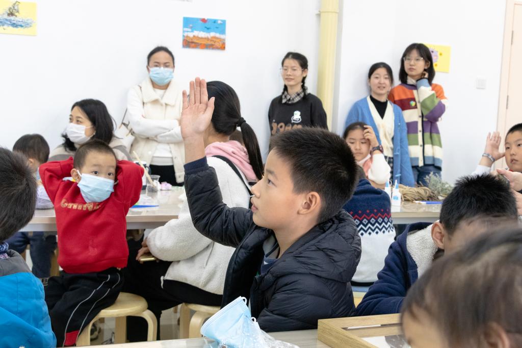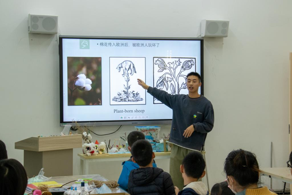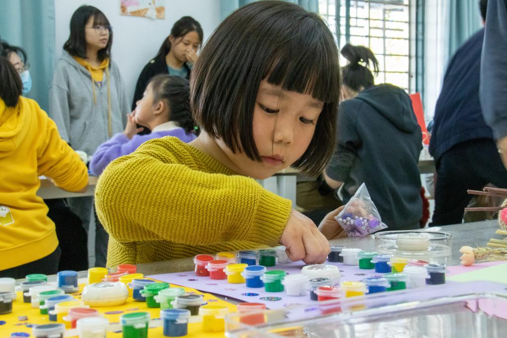 在制作棉花画这一环节中,戚杰同学首先向孩子们介绍了棉花的相关知识,吸引了孩子们对棉花的兴趣。随后,孩子们在家长的帮助下,利用棉花与其他各式各样的材料,动手制作棉花画与小工艺品,勾勒出自己脑海中天马行空的想象。有的孩子用水彩颜料在画板上绘出自己的心中奇花异草与水秀山明,有的孩子则在小漂流瓶里填充自己的云端梦境,有的孩子选择在相框中搭建自己的理想城堡。孩子们最后做好的棉花画与小工艺品风格迥异,各具特色。