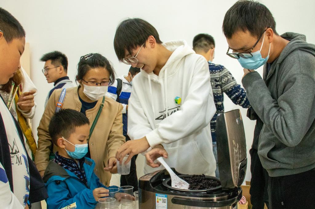 “大家都吃过什么颜色的稻米呀?”“白色!”“我吃过黄色的!”“还有黑色!”在江洋老师为孩子们带来的水稻栽培与黑米的加工和烹饪这一科普课程中,江洋老师用生动的图片形象地向孩子们展示了水稻在进化历程中的“亲朋好友”以及稻米从稻穀、糙米制成可以食用的白米的加工过程。“那种植水稻需要哪些东西呢?”江洋老师向小朋友们提问道,“阳光!土壤!还有稻草人!”在座的孩子们争先恐后地抢答,答案层出不穷。随后,江洋老师为孩子们展示了餐桌上的明星食物——黑米,介绍了黑米作为糙米的众多好处,并现场演示使用黑米脱壳机来对黑米进行去皮加工操作,孩子们对这一未知事物产生了极大兴趣,纷纷围观江洋老师的操作过程。最后,江洋老师给孩子们提供了煮好的黑米饭,孩子们依次领取,共同品尝黑米饭的别样风味。