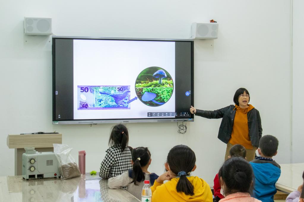 “蘑菇除了吃还能做什么呢?”“制成药品!用作肥料!”在题为“美丽蘑菇隐藏的奥秘——蘑菇菌丝体与栽培应用篇”这一科普课堂中,徐章逸老师带领孩子们认识自然界中各种各样的蘑菇。从最为常见的香菇、木耳,到未曾目睹过的珊瑚菌与荧光小菇,丰富多彩的蘑菇形态与琳琅满目的蘑菇种类深深吸引住了孩子们的注意力。“这个蘑菇颜色这么鲜艳,是不是毒蘑菇呀?”有的小朋友指着颜色艳丽的出血齿菌大声问道,“出血齿菌颜色看起来很害怕,但是还是可以吃的。”徐章逸老师耐心地回答孩子们的问题。随后,徐章逸老师向孩子们介绍了从蘑菇孢子发育成完整个体的发育历程与实际生产生活中的菌棒制作过程。课程结束后,孩子们每人领取到了一个香菇菌袋,带回家里面进行培养。