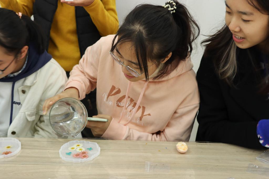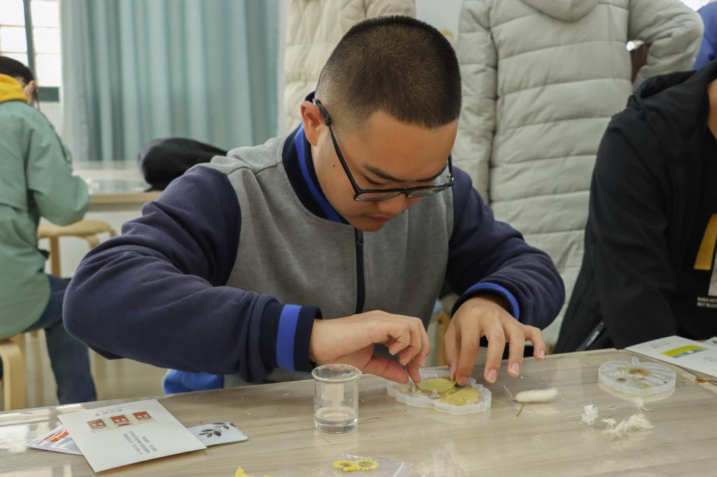 活动中途,工作人员指导同学们按照一定的比例自主配制凝胶,然后用干花与凝胶制作精美的书签以及杯垫等工艺品。在这个环节中,同学们各显神通,有随意发挥的抽象派,也有构思严谨的写实派。“我很想念广东的小榄菊展,所以我在这里放了各种颜色的小菊花。”来自植生2107班的赖天赐同学这样说道。工作人员也给风格迥异的艺术作品们进行了拍照留念,并给参与的同学们发放了精美的纪念品。植生2107班的杨铄同学分享道:“在充斥着许多繁重课业的忙碌生活之外,可以参与这样一个有意思的活动,既放松了身心,又感受到了自己动手制作工艺品的魅力,可以说是此行不虚!”