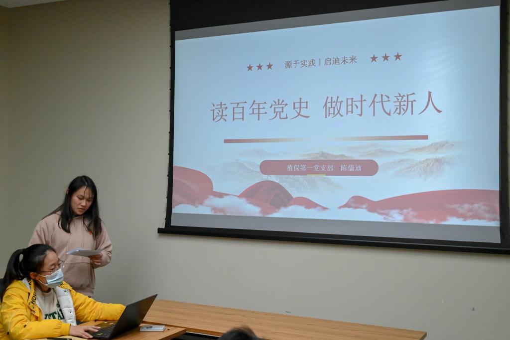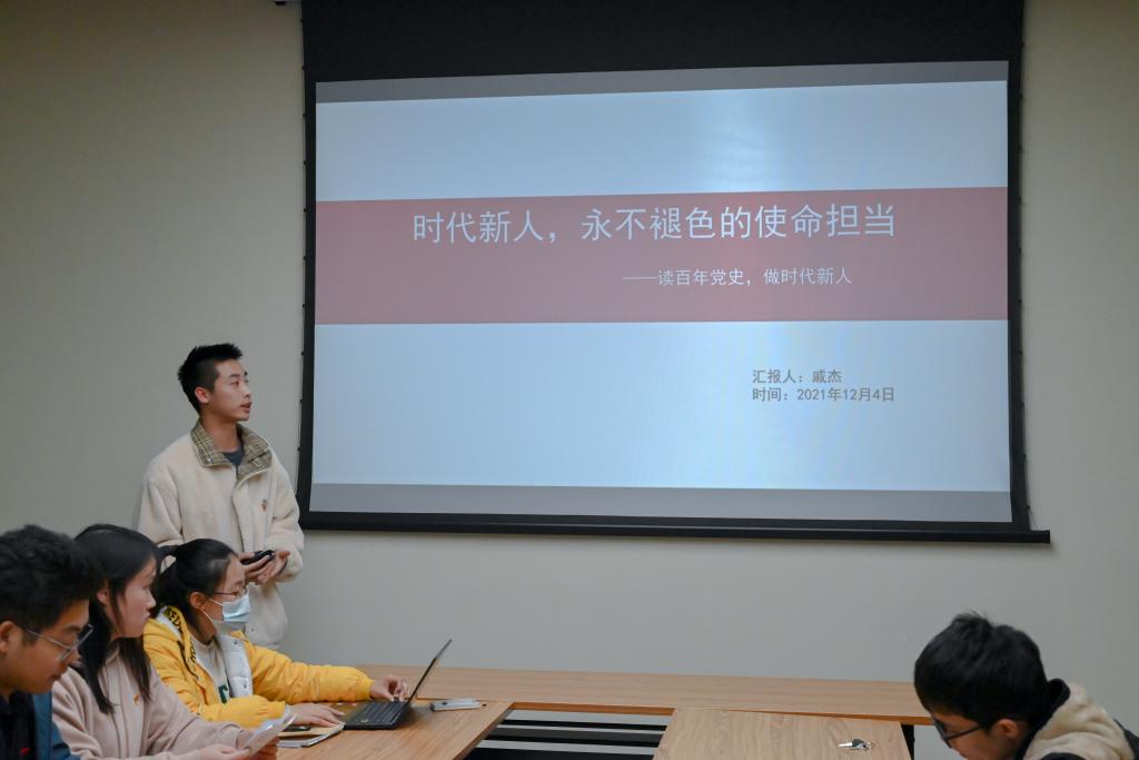 随后,陈儒迪同志从“是什么”,“为什么”,“怎么做”,“从实践出发”四个方面,全面地向大家讲述了学党史的重要性。她从1921年至2021年党的百年历程出发,向同学们讲解了《中共中央关于党的百年奋斗重大成就和历史经验的决议》,并以学史明理、崇德、增信、力行四个方面告诉我们应该如何紧跟党走。陈儒迪强调,在实践中要有坚定的理想,将个人发展同国家民族的前途命运紧密相连;要有真本领,学有所长、学有所专、专有所精,以丰富的知识和过硬的本领,脚踏实地为社会主义现代化强国而奋斗;面对重大挑战、重大矛盾、重大阻力、重大风险、必须进行许多具有新的历史特点的伟大斗争。