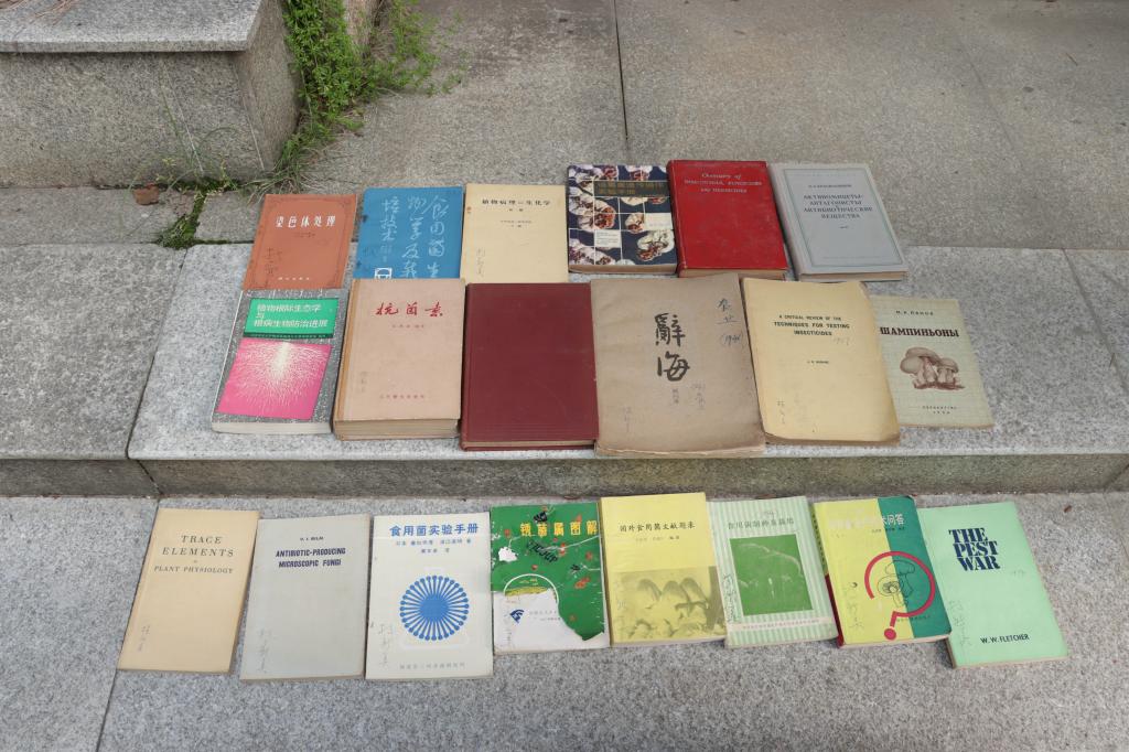杨新美教授的半身铜像耸立在主楼一侧,他戴着眼镜,目光温和,深情地注视着这片多情而温暖的大地。“杨新美先生是我国应用真菌学的先行者和奠基人之一,他曾为推动我国的香菇产业的发展铸下不朽功勋。”陈新博士站在雕像旁,为现场的师生讲解杨先生的生平事迹,而他紧紧抱着的旧书,正是他和师弟李正收集到的杨新美先生曾读写过的书籍。“在很多人眼里,这些旧书可能一文不值,但在我们眼中,却如连城之璧,”陈新饱含深情地说道,“虽然集书的过程漫长而又艰辛,但它们和真菌楼一样,都是杨新美先生的精神图腾,都有着属于我们真菌团队独有的辉煌岁月与文化印迹。”
