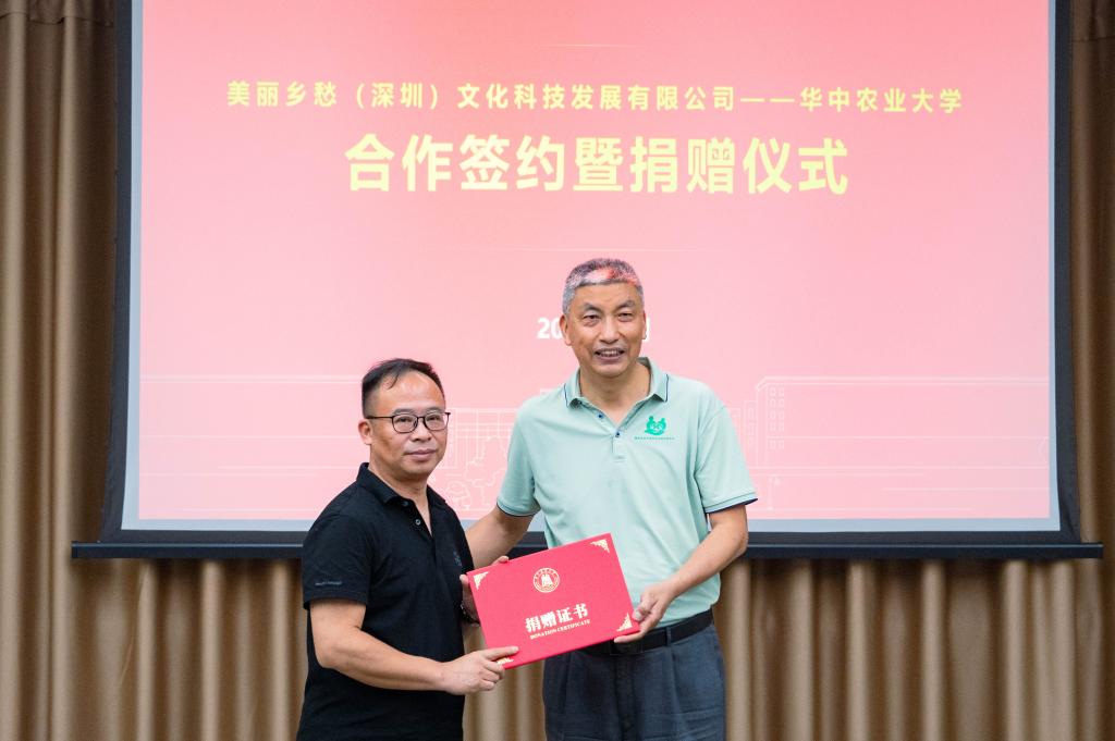 在捐赠仪式上,朱龙付介绍了校情院史以及公司在人才培养、科学研究等方面的情况,期待以后与美丽乡愁(深圳)文化科技发展有限公司在乡村振兴方面开展更加深入广泛地合作。
