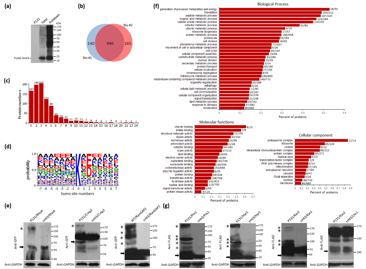 These gene knockouts also resulted in shorter mycelial cells, fewer conidial septa, and appressed mitotic anomalies such as mitotic nuclei, suggesting that SUMOylation plays an important regulatory role in the cell cycle-related biological processes of Pyricularia oryzae. It was further found that these knockouts exhibited varying degrees of sensitivity to cell wall inhibitors, osmotic pressure, reactive oxygen species, alkaline pH and other environmental stresses, and that various environmental stresses could induce the increase in the SUMOylation level of wild-type strains. It indicates that the SUMO modification plays an important role in the environmental response process. Through SUMOylation-modification proteomic analysis, 940 SUMO-modified candidate target proteins were identified. Bioinformatic analysis showed that they participated in a large number of biological processes related to the above phenotypes, and a large number of reported pathogenic proteins related to rice blast may have been identified. It is a SUMO-modified target protein, including proteins related to the process of nutrient storage, environmental response, cell cycle, and signal transduction.