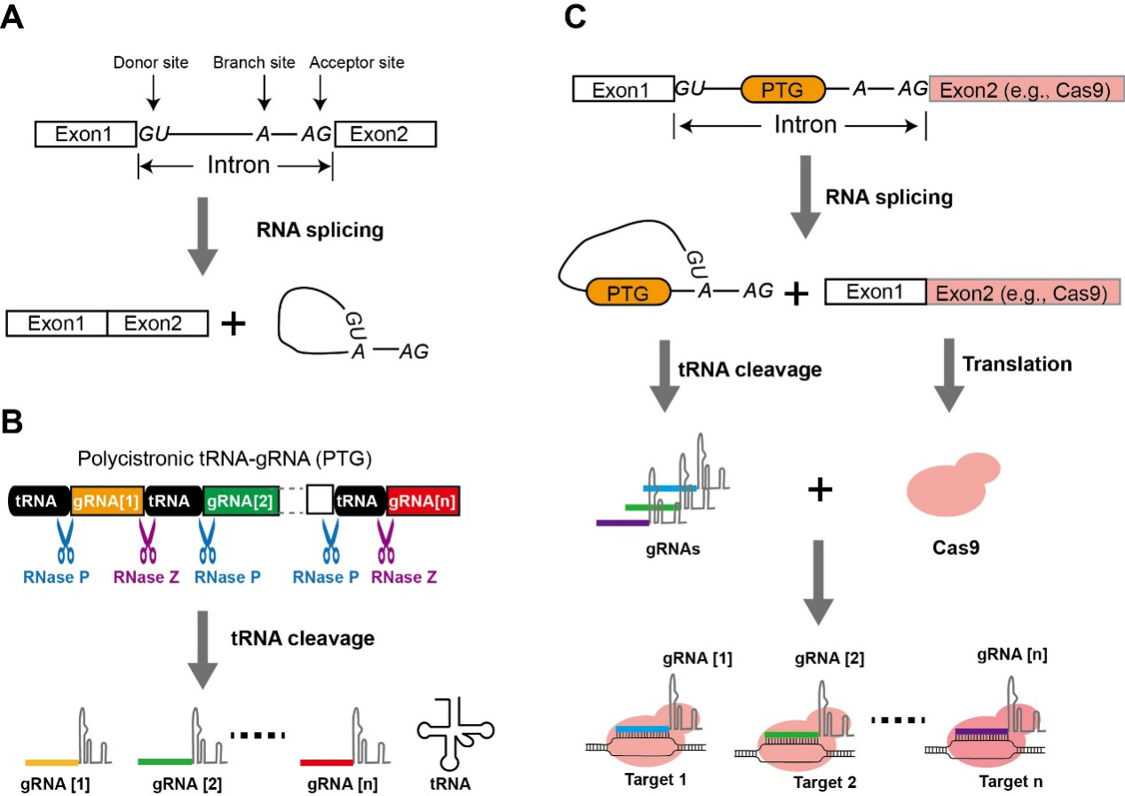 The Genome Editing technique based on the CRISPR-Cas9 is not only regarded as the revolutionary technique of the life science in these years but also one of the most intense fields in science research. As to the gRNA and Cas9, which is used to express the CRISPR-Cas9 technique more efficiently in organisms, Kabin Xie’s research group has borrowed the intron shearing system and tRNA processing system cleverly to transform the introns into the expression platform of the gRNA. Going step further by mixing intron and Cas9 together into one gene, they achieved the coordinated expression of Cas9 and gRNA.