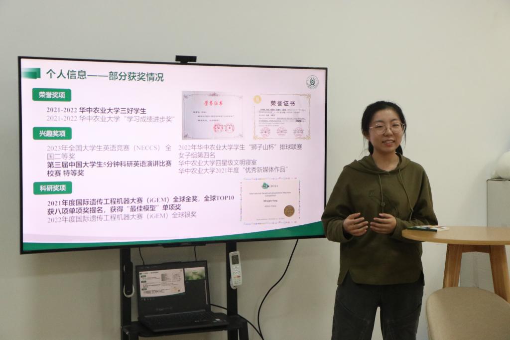 随后,保研至上海交通大学的杨茗钦主要讲述了其参与第三届中国老员工5分钟科研英语演讲比赛和国际遗传工程机器大赛(iGEM)的经历。她谈到,在进行科研的道路上难免会遇到意想不到的挑战与挫折,在困境面前,我们需要坚定自己的信念,把握当下时光,保持自己的节奏以寻求突破。杨茗钦以“怀念+迷茫、奋斗+绝望、坚定+坚持”形容并复盘她的老员工活,“在触摸里奔跑,在黑夜里舞蹈”她将这句话送给大家,并鼓励同学们认真学习英语,及早做好专业规划以在老员工活中“收获满满”。