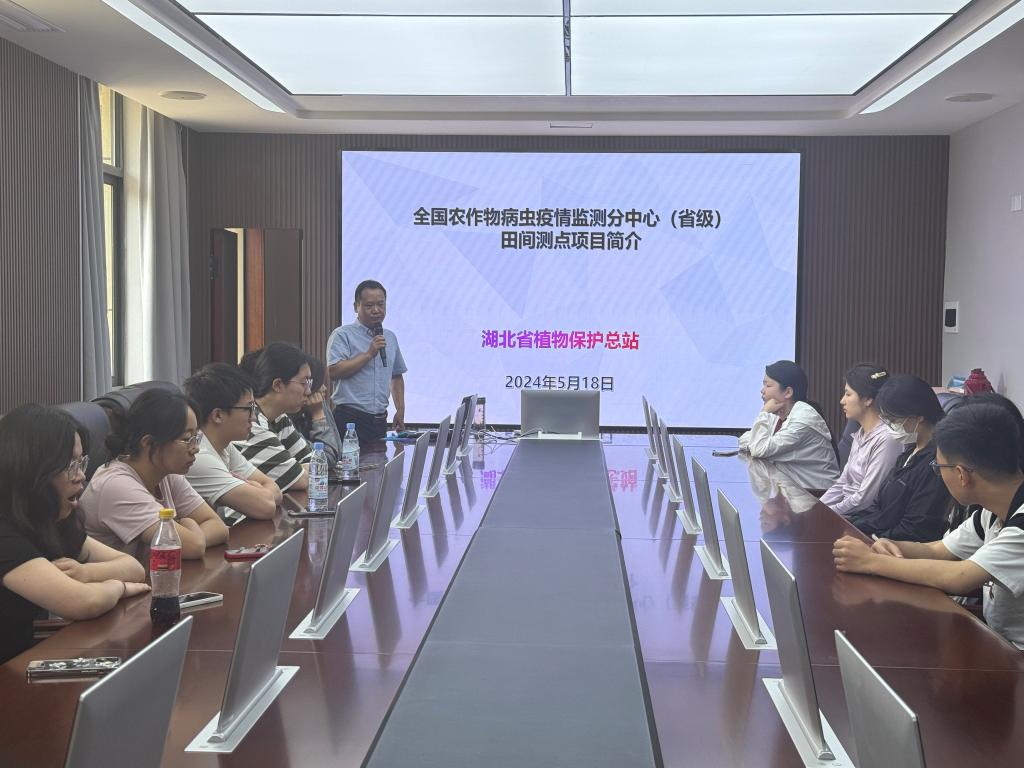严俊杰向师生介绍了植保总站的历史沿革与工作内容。他表示,湖北省植保总站作为全省植物保护工作的牵头单位,肩负着病虫疫情监测、预警、防控的重要职责。“随着智慧植保新方向的兴起,我们在田间监测中引入了先进的监测设备,运行云端平台,探索‘大数据+植物保护’新模式,正在逐步向着技术人员足不出户就能掌握在病虫害情况的方向努力”杨俊杰与同学们交流到。