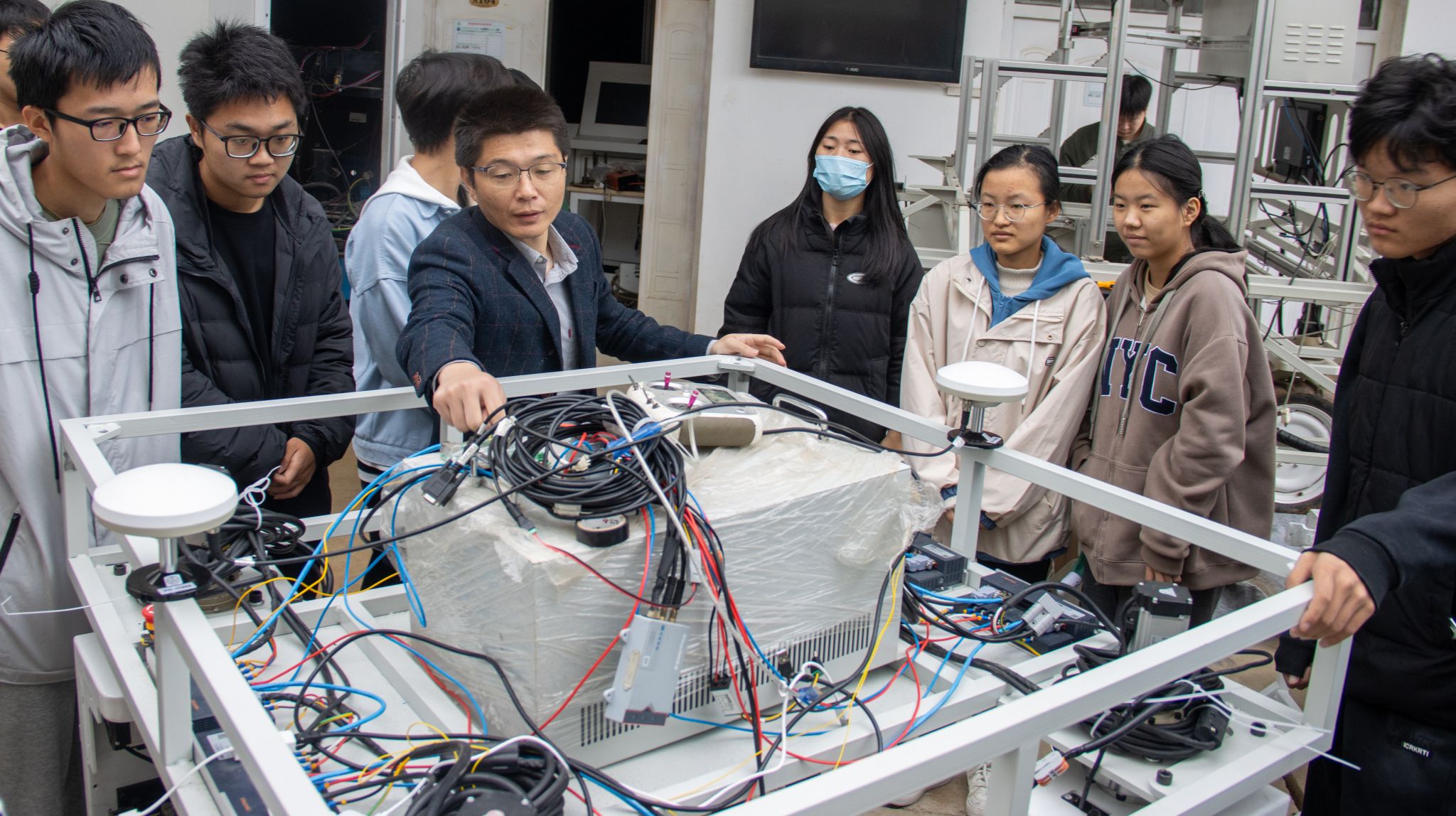 随后,宋鹏带领同学们参观农业机器人,对两个“机器人车”的系统架构、电机驱动、核心算法进行了详细讲解。“虽然农业机器人的研究尚未触及所有精细、复杂的领域,但在农业这一作业环境相对复杂的领域已经有了应用。”宋鹏鼓励同学们全面掌握农业机器人相关知识,立志成为农业科技领域的顶尖人才。