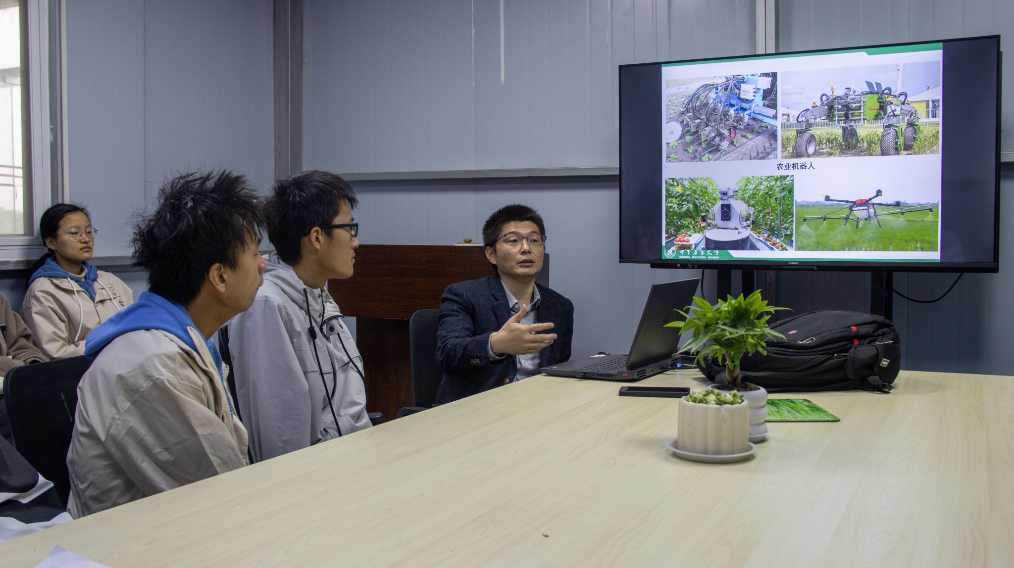 宋鹏首先向同学们介绍了作物表型检测技术。他谈到,通过开发软硬件为植物做“体检”,将其生长状况量化、数字化,不仅可以为植物开“药方”,让其更好地生长,还能通过基因关联分析,实现遗传改良,显著提高育种效率。而农业机器人是为作物表型服务的,不仅能够搭载传感器完成作物表型检测,还能广泛应用于采摘、喷洒等农业生产环节,展现了智能化装备在农业领域的巨大潜力。
