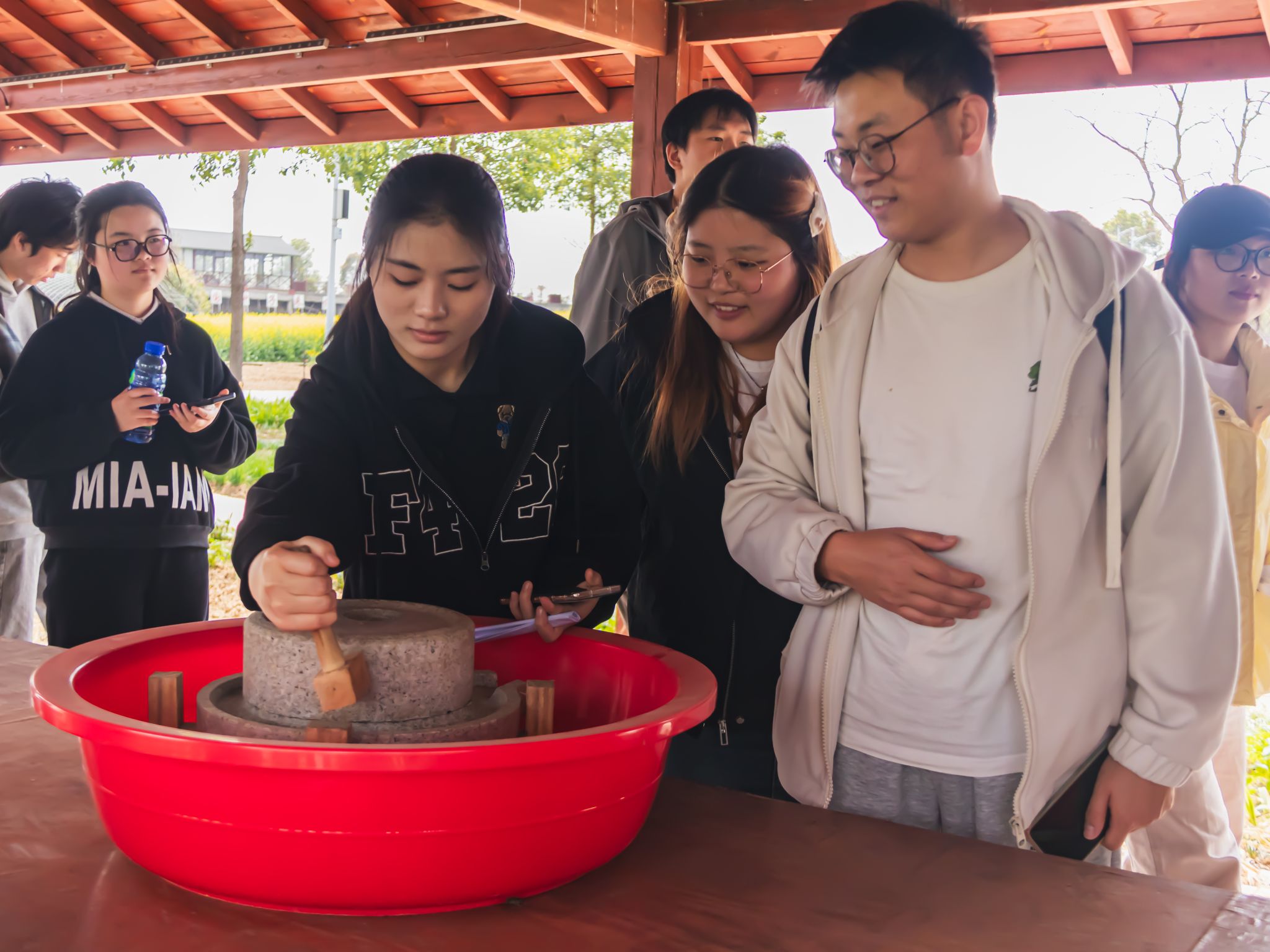 在农场负责人的带领下,师生们首先来到传统农田耕作示范区。同学们挽起裤腿,手握木犁,在讲解员指导下,一人推犁,两人拉绳,体验传统耕作方式。"看似简单的木犁,操作起来需要巧劲和耐力,我感受到了传统耕作方式的不易"智农2304班的劳玉鑫感慨道。随后,师生走访参观农场水韵书吧、耕读学堂、稻田米铺等地,体验了古法磨豆浆、古法造纸、活字印刷等特色项目,农场集种养、游乐、休闲为一体的经营模式让同学们大开眼界。