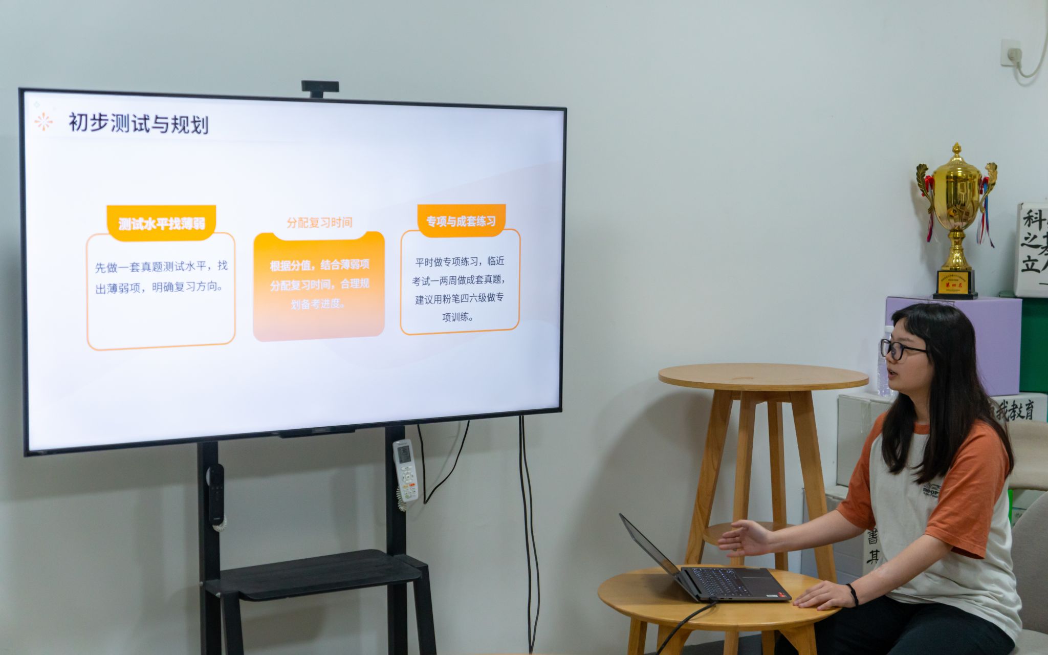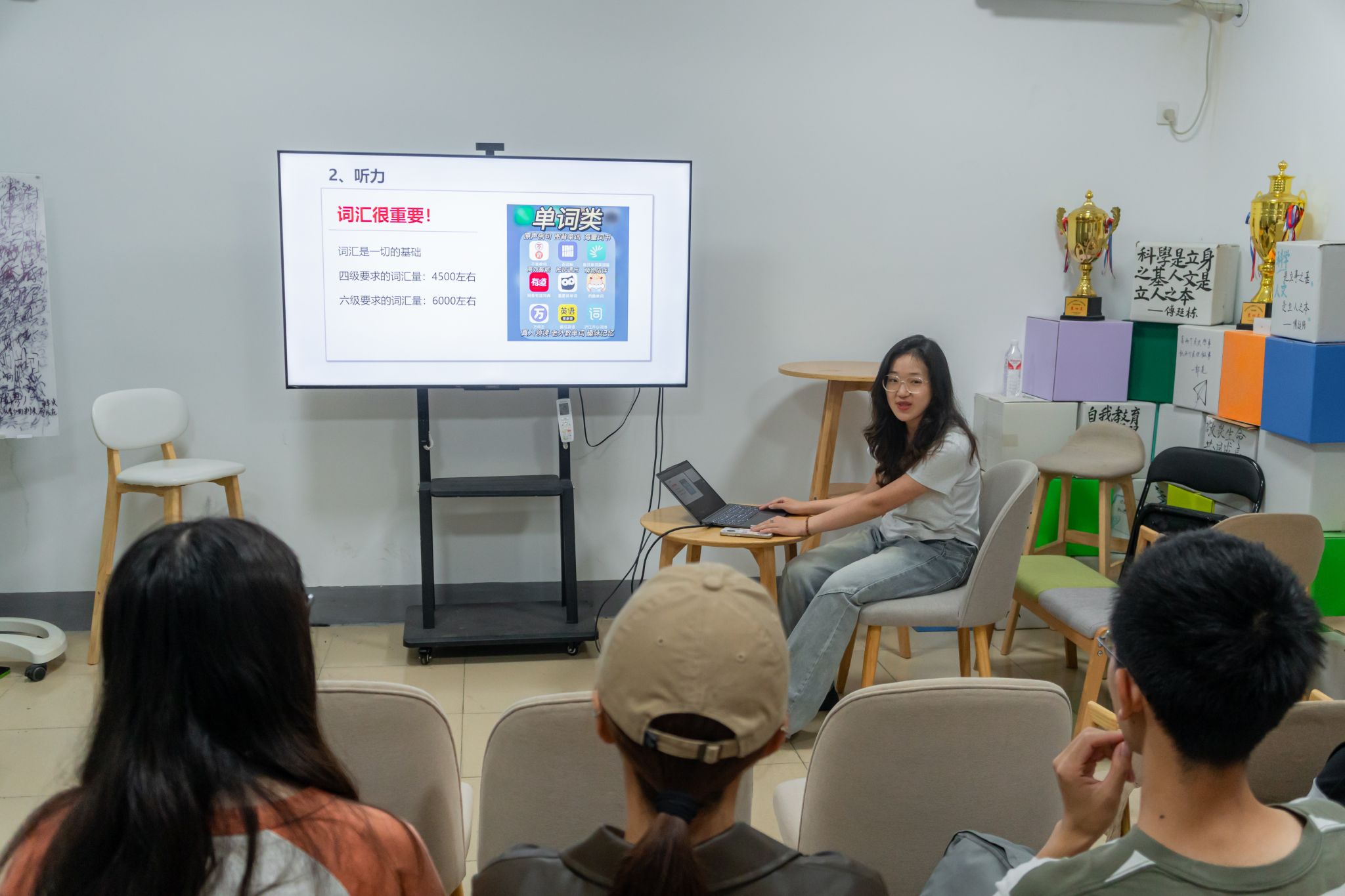 活动伊始,英语四级成绩658分的任瑞涵率先分享。任瑞涵结合自身经历,详细介绍四级考试各题型特点与应对技巧。她强调词汇积累是关键,建议制定合理的单词背诵计划,运用多种方法强化记忆。听力备考方面,她推荐精听、泛听结合,利用真题反复练习;阅读部分,她分享了快速定位关键信息、把握主旨的方法,并提醒合理分配时间;写作和翻译板块,她鼓励同学们多积累优秀表达与句式,勤加练习。