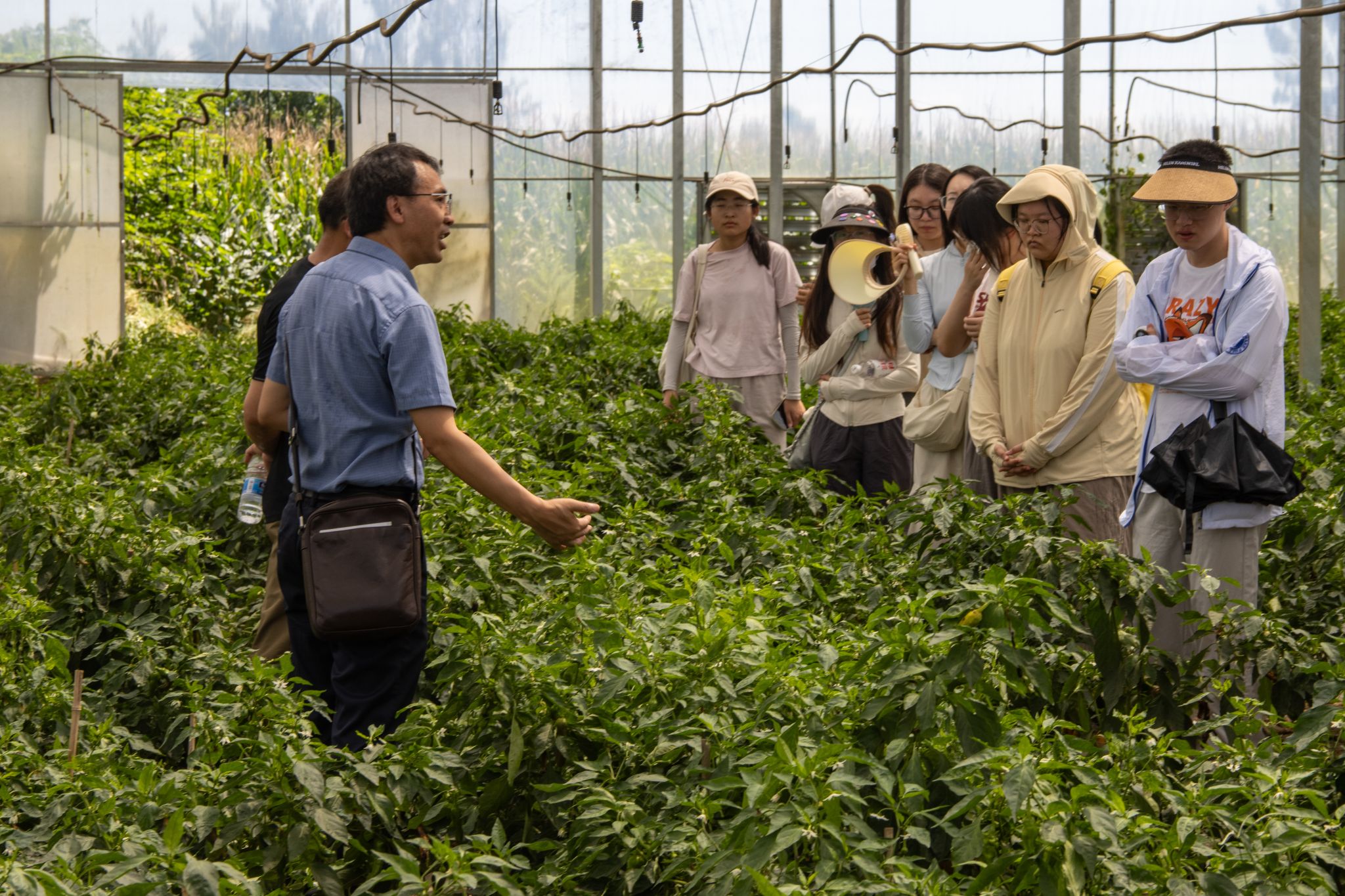 当日上午,师生一行抵达湖北大沃生态农业有限公司大棚蔬菜种植基地。公司总经理汪文俊围绕武汉地区气候与地形特点,系统讲解了辣椒种植的关键技术。汪文俊指出,辣椒虽具有常年开花、持续结果的特性,但受武汉夏季高温影响,即使配备温控设备,棚内温度仍难以精准维持在最佳生长区间。因此,当地辣椒种植普遍需在七月前完成播种。