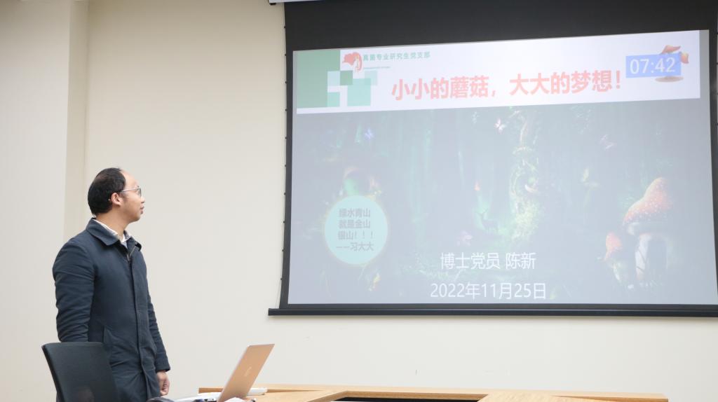 真菌党支部博士生党员陈新从自己的专业角度出发,讲述“小小的蘑菇,大大的梦想”的故事。作为蘑菇界的追梦人,他有着天马行空的梦想又有着脚踏实地的努力,行走在青山绿水中,往返于实验室与温室之间,与日月同行。他积极宣传蘑菇文化,带领同学们上山采集样本,下乡指导乡亲们蘑菇的栽培技术。他也带着他的蘑菇走出国门,助力南南合作,向外国友人传递食用菌知识和技术,助力脱贫,以自己的蘑菇梦筑力中国梦。
