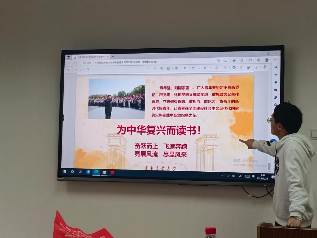 会议伊始,党支部书记杨皓昀带领大家学习了新发布的《中共中央国务院关于做好2023年全面推进乡村振兴重点工作的意见》,详细阐述了文件中关于抓紧、抓好粮食和重要农产品稳产保供这一部分内容,重点分享了国家在油菜作物上的重要政策,如统筹油菜综合性扶持措施,推行稻油轮作,大力开发利用冬闲田种植油菜。随后,杨皓昀带领大家学习了“开学第一课”,他表示“2023年放开以后,中国经济发展将造福全世界,中国式现代化建立在时代之上,是社会主义发展的必然结果,它体现在方方面面,是五位一体总体布局的精髓凝聚。