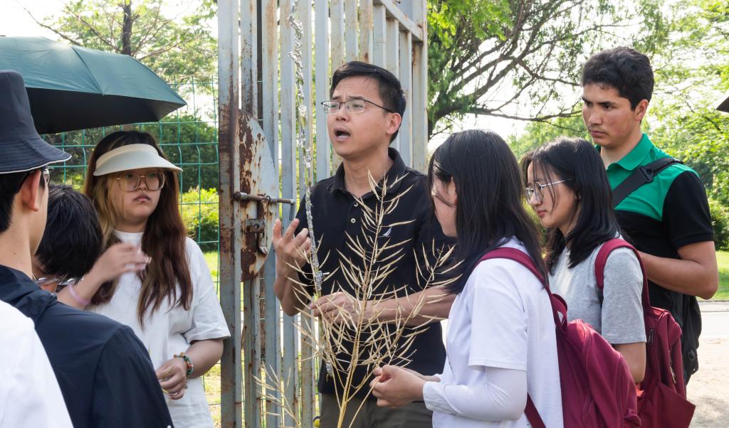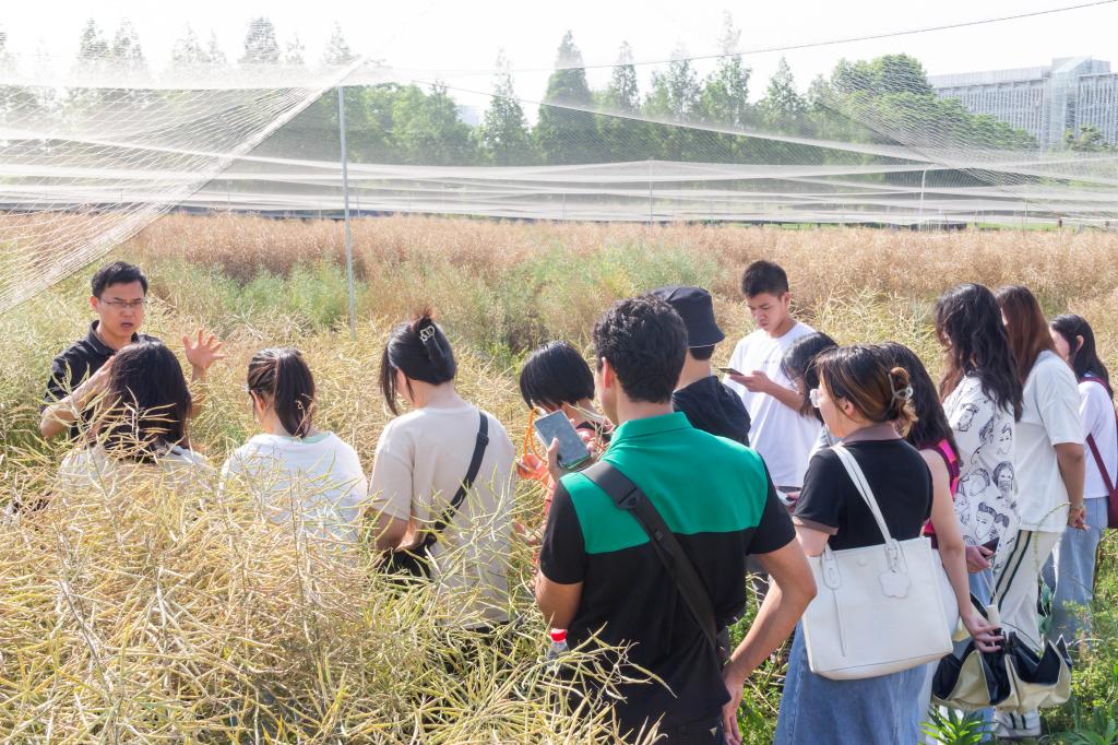 汪波以活动主题“走进试验田—油菜地里琵琶黄”为引,向同学们介绍了油菜枇杷黄的形成原因和对于生产的指导意义,激发了同学们的参观热情。参观试验田途中,汪波向同学们讲述了油菜的“前世今生”和重要用途。油菜是我国重要的油料作物,也是优质的蔬菜和饲料。油菜不仅能提供食用油、蛋白质和维生素,还能改良土壤、防治病虫害、净化环境、美化景观等。他指出,目前我国油菜的种植面积和产量在全球位居前列,但在品质、抗逆性和利用效率方面还有很大提升空间。