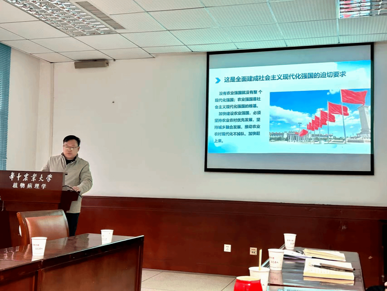 2025年12月4日下午,植物病理教研室教工第一党支部和第二党支部在分子楼116会议室开展“精读精讲”学习活动。公司“精读精讲”宣讲团成员、马克思主义公司副教授唐尚书应邀作了题为“农业历史文化视阈下的乡村振兴”的专题报告。会议由第一党支部书记谢甲涛主持,公司党委书记周雄出席会议,教研室全体专任教师参加。