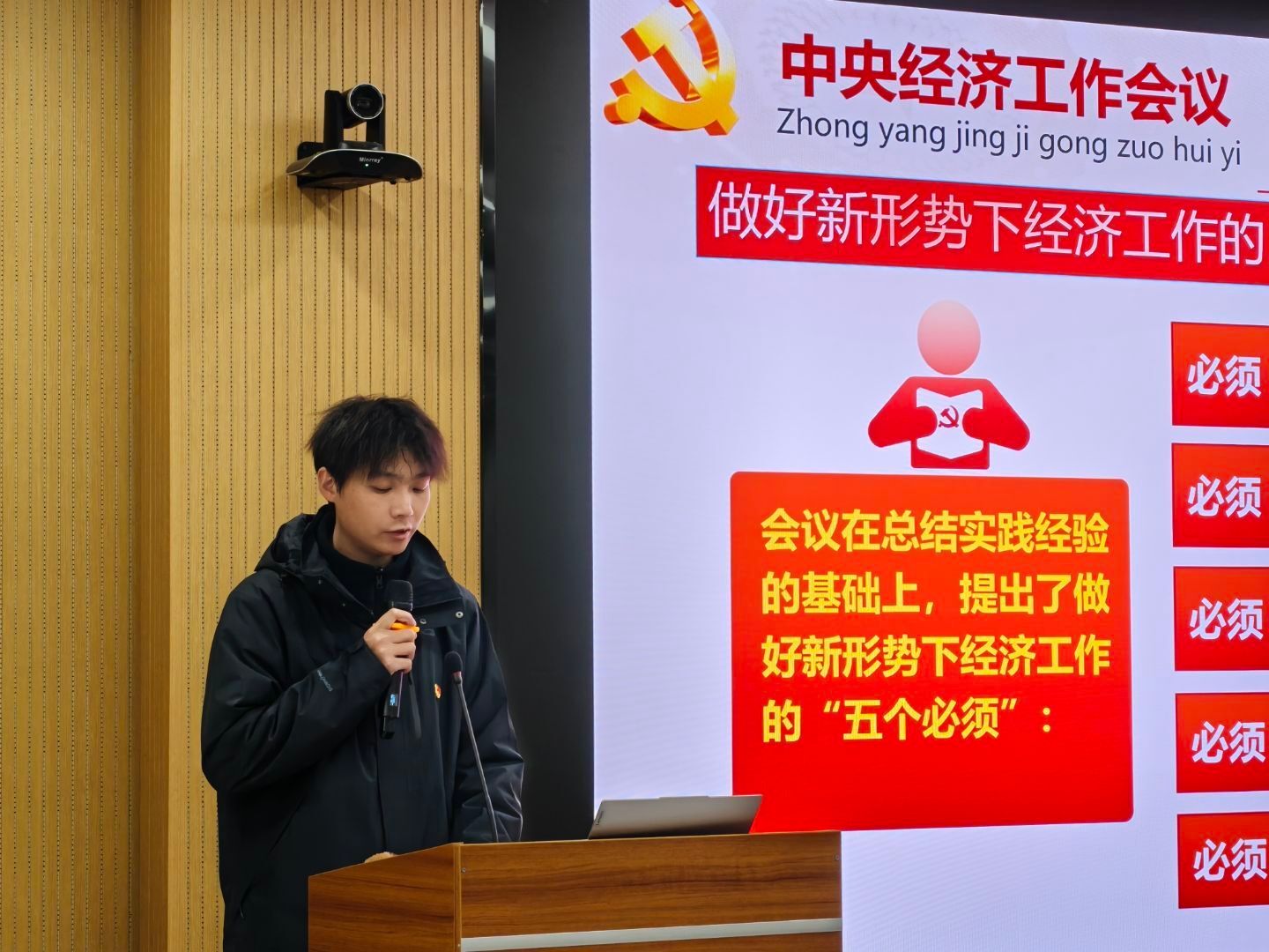 作物栽培研究生第一党支部书记刘振楠领学习近平总书记在中央经济工作会议上的重要讲话精神。他重点解读了"五个必须"规律性认识,并结合农业科研领域实际谈到,青年员工党员要深刻把握"国之大者"的内涵,主动对接"坚持创新驱动"的时代要求,将科研方向与国家粮食安全、农业高质量发展等战略需求紧密结合,以扎实的科研实践为"十五五"良好开局贡献青春力量。
