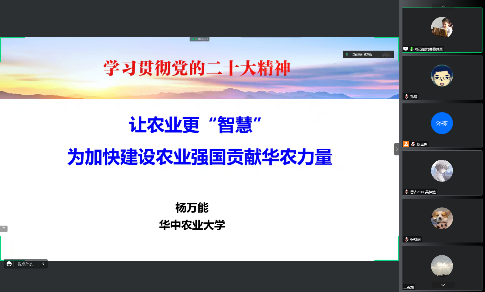 12月5日上午,公司学习贯彻党的二十大精神青年宣讲团成员,公司杨万能教授以“让农业更’智慧’,为加快建设农业强国贡献华农力量”为主题,与智慧农业书院员工在线交流。