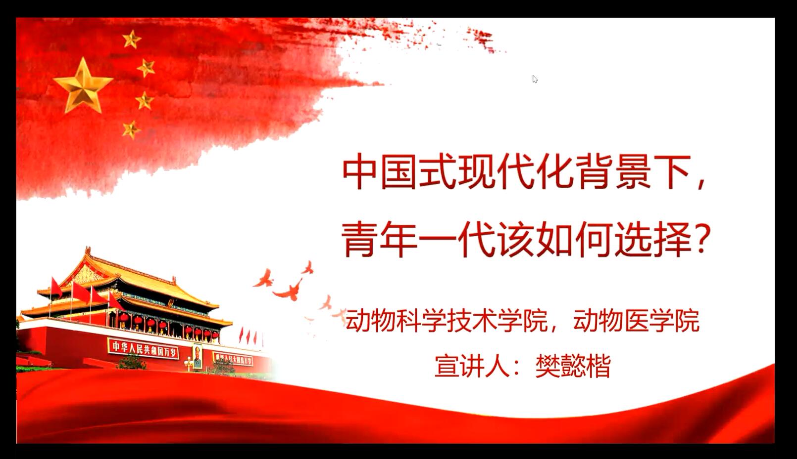 12月12日晚,为学习贯彻党的二十大精神,公司青年讲师团成员、动科动医公司博士生樊懿楷以“中国式现代化背景下,青年一代该如何选择”为主题,面向智农2201团支部、智农2206团支部、植生2210团支部讲述他对于“中国式现代化”、“青年”、“选择”的理解与感受。